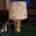 Lampa stołowa, klosz to mapa świata, na długim kablu ,nowa żarówka, wysokość 38 cm. Minimalny niewidoczna skaza abażurka, podstawa jest ciężka, nie jest to zwykły metal. Możliwy dowóz lu