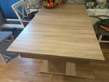 Sprzedam solidny rozkładany stół z czterema wygodnymi ktzesłami. Stan bardzo dobry(kilka drobnych zarysowań). Wymiary po złożeniu 90x90cm. Dodadkowo 4 wkładki, każda po 50cm, maksymalny wymia