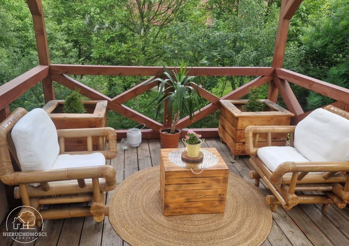 Z salonu prowadzi wyjście na zadaszony taras - doskonałe miejsce na odpoczynek niezależnie od pogody.