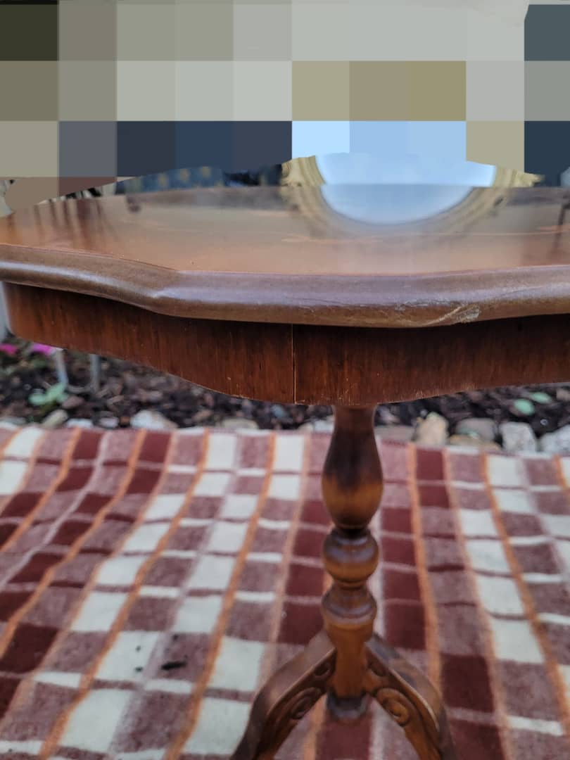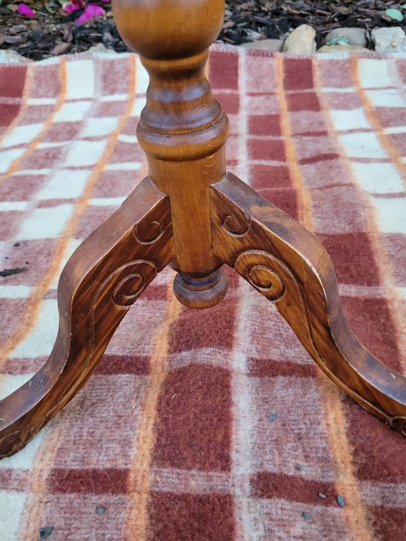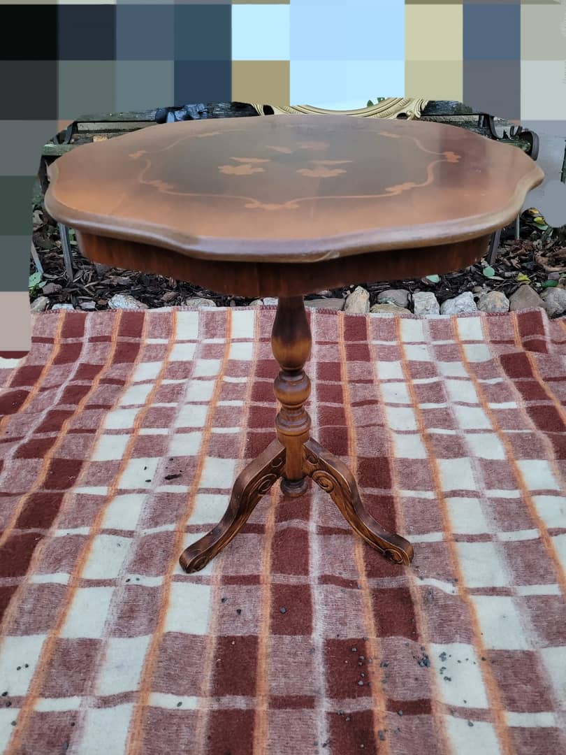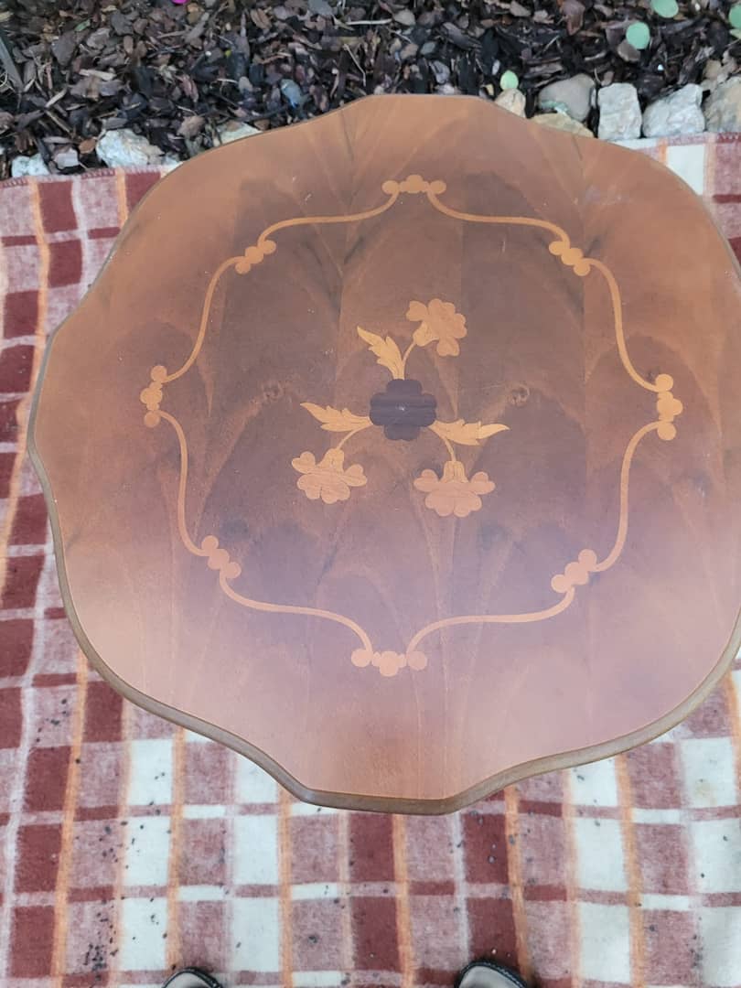 Stolik kawowy drewniany intersjowany, średnica 51 cm, wysokość 57 cm. Cena 200 zł. Możliwy transport.