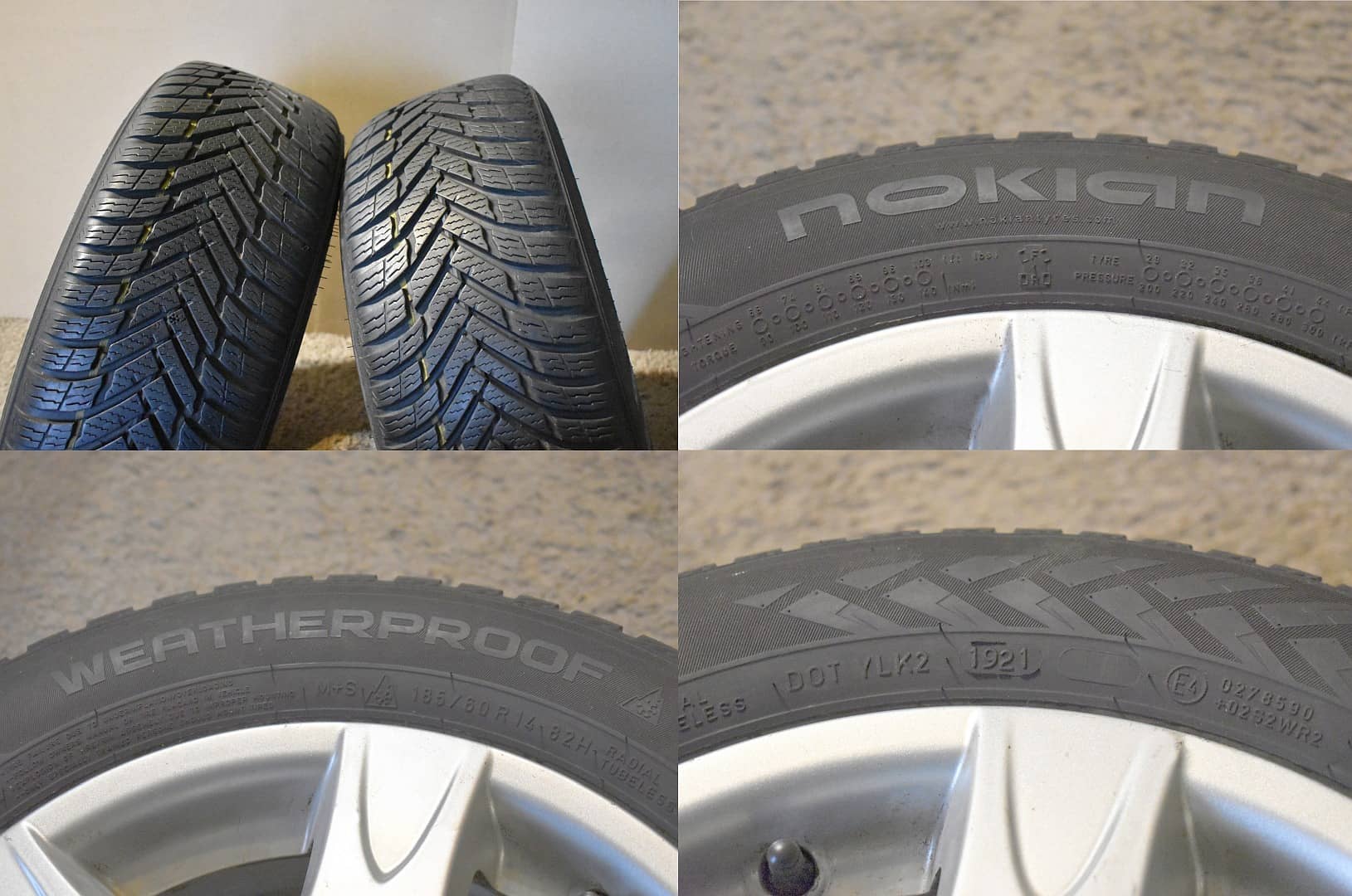 Komplet kół 185/60 R14 82H na alu felgach 6Jx14 ET43. Opony NOKIAN całoroczne prawie nowe mało jeżdżone (data produkcji 19 tydz./2021r.)