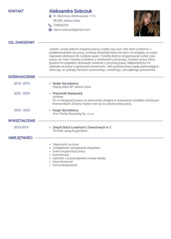 Mam doświadczenie w gastronomii, również na stanowisku kierowniczym oraz handlu. Szybko się uczę więc też nie wykluczam innych rodzajów pracy.