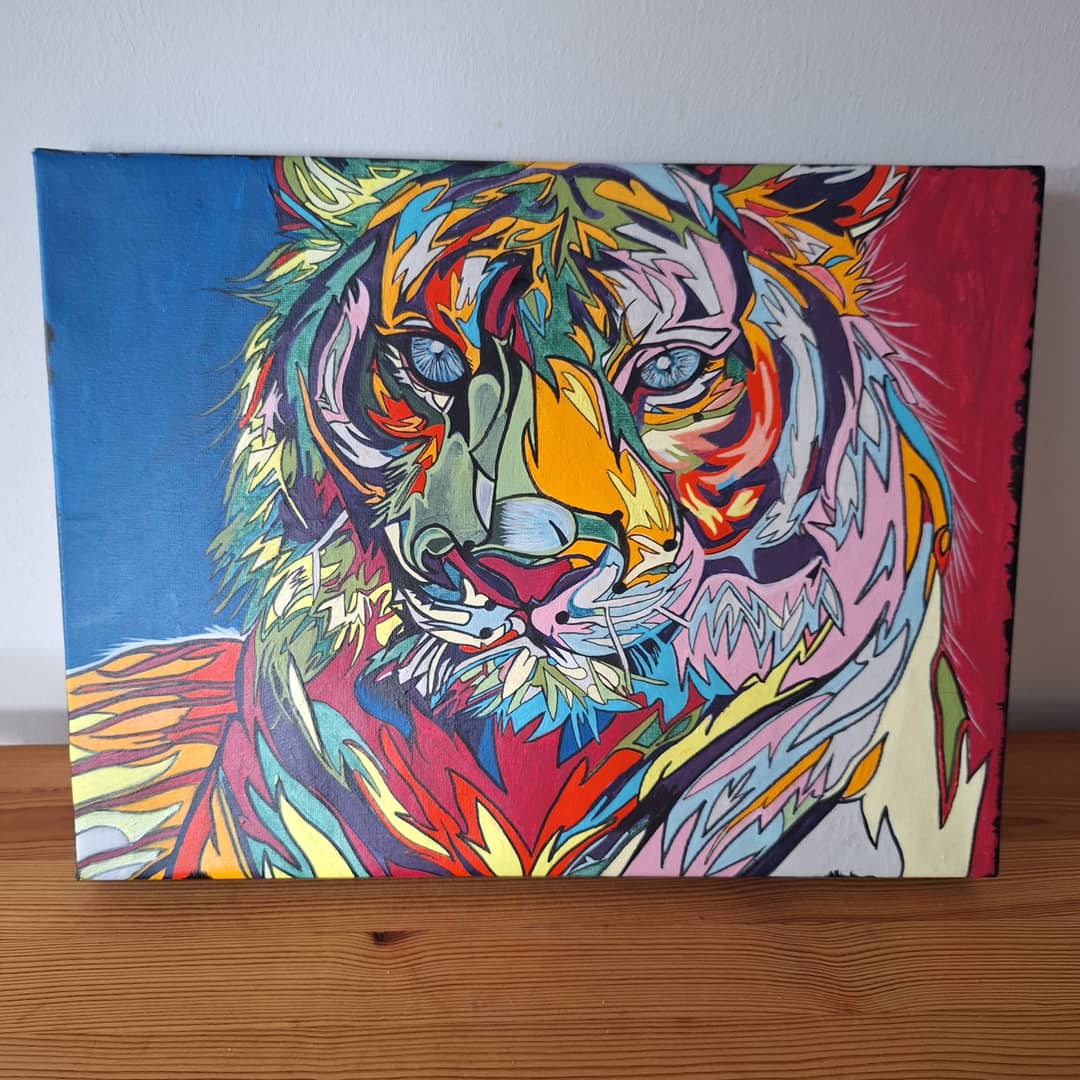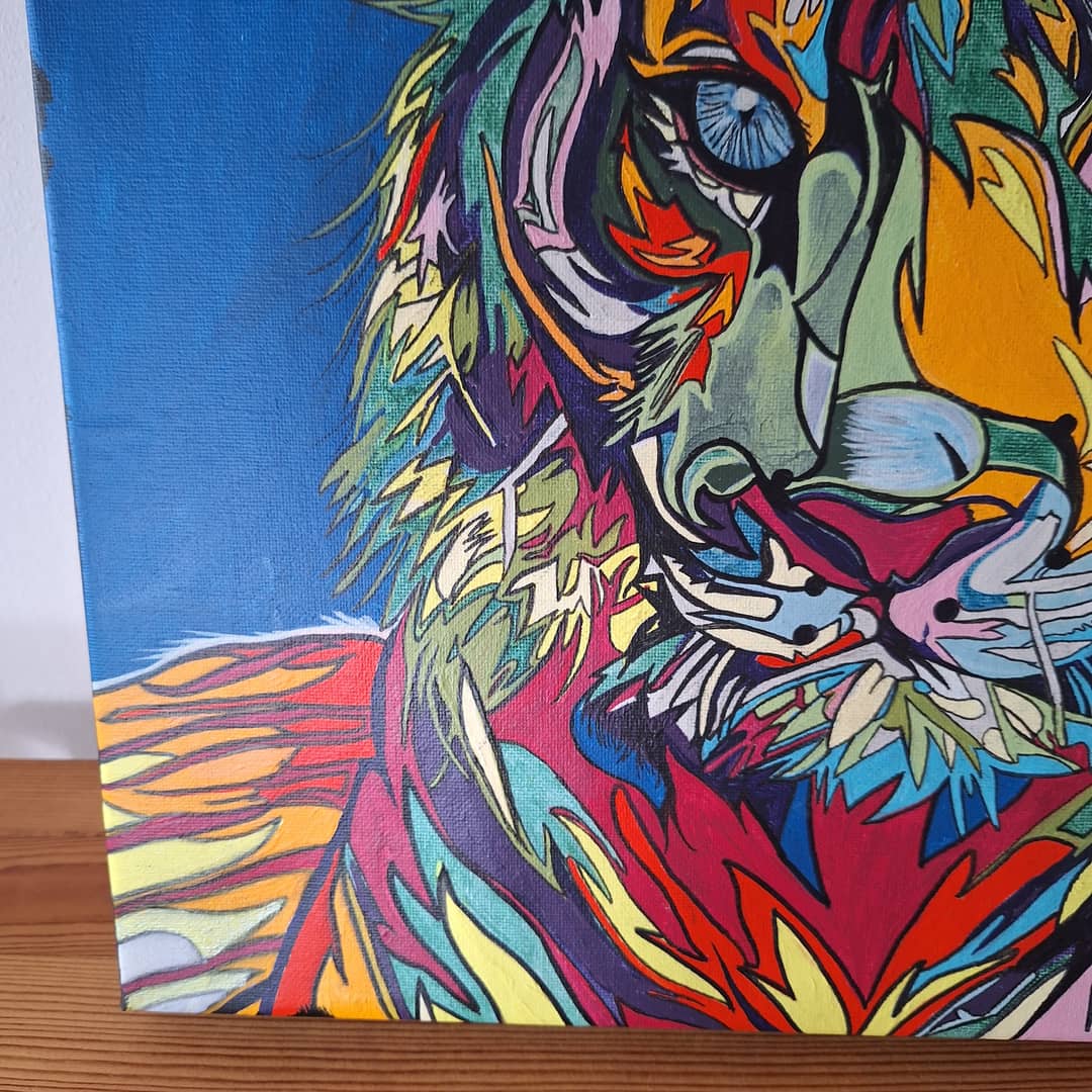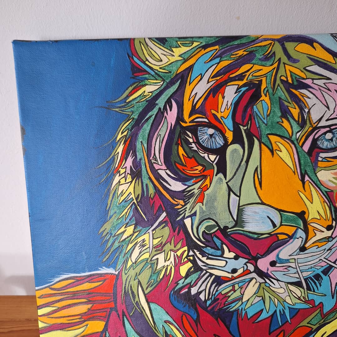 Obrazek z lwem, typu malowanie po numerach, kekki, w srebrnej ramce .Wielkość50/40 cm.Możliwy dowóz lub wysyłka. Cena 40 zł.