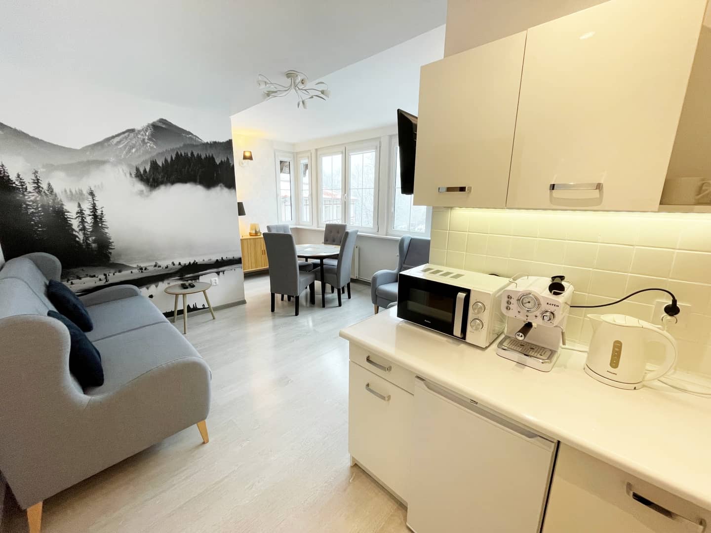 - salon z aneksem kuchennym, wyodrębnioną częścią jadalnianą, częścią wypoczynkową oraz pięknym widokiem na góry
