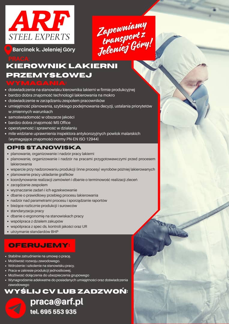 ARF STEEL EXPERTS w Barcinku, nowoczesna produkcja wyrobów i konstrukcji stalowych, zatrudni od zaraz pracowników: Kierownik Lakierni, Operator Prasy Krawędziowej Oferujemy stabilne zatrudnienie w oparciu o umowę o pracę lub B2B. Gwarantujemy rozwój zawodowy, praca w zakresie produkcji jednostkowej, kompleksowe wdrożenie, konkurencyjne wynagrodzenie. Zapewniamy transport z Jeleniej Góry