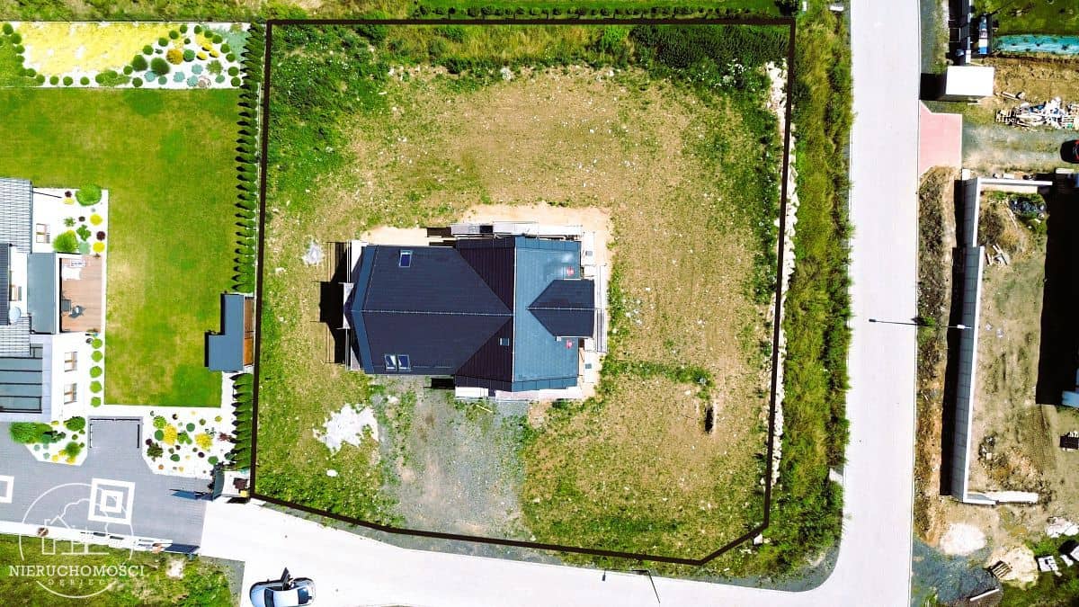 Dom posadowiony na kwadratowej, płaskiej i dobrze nasłonecznionej działce o powierzchni 1695 m2.