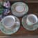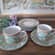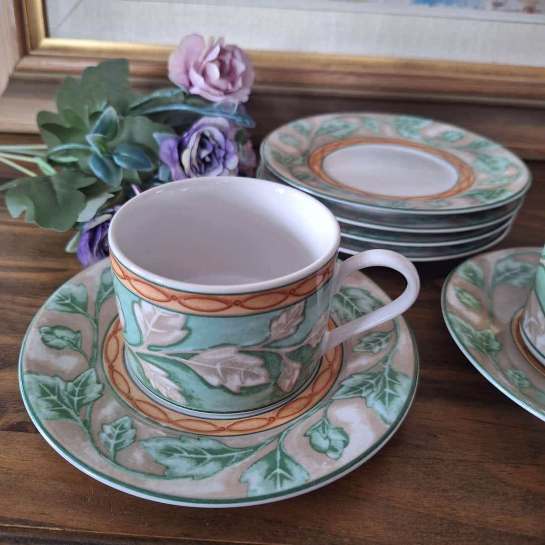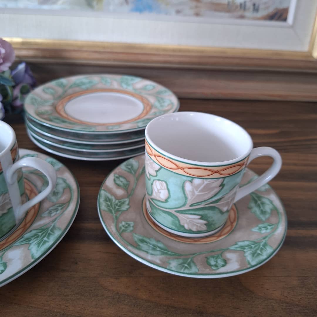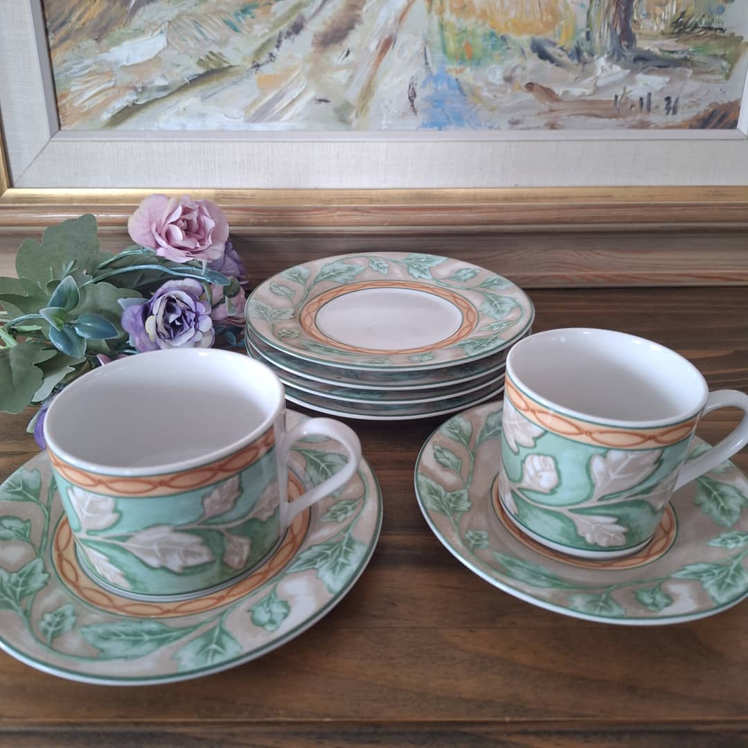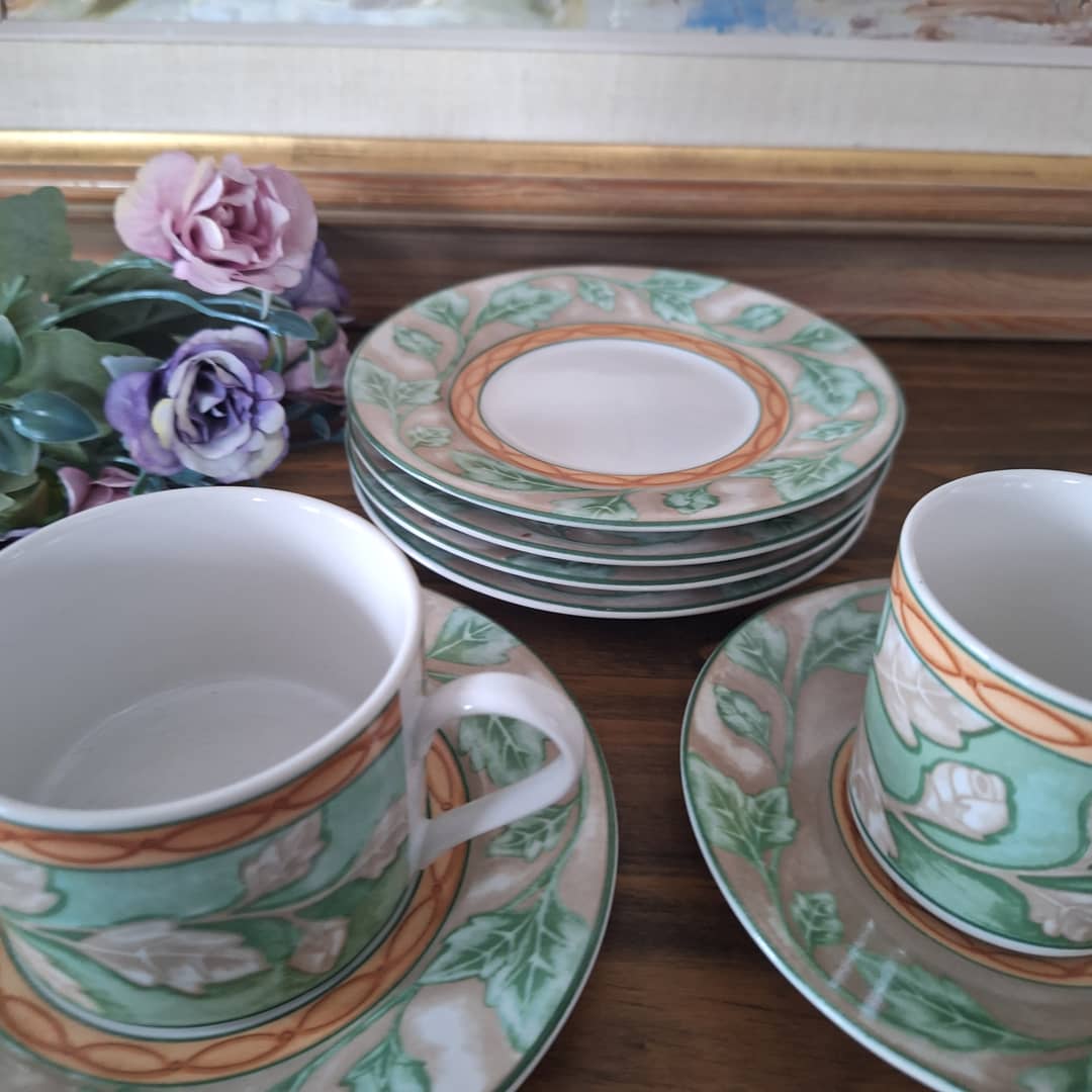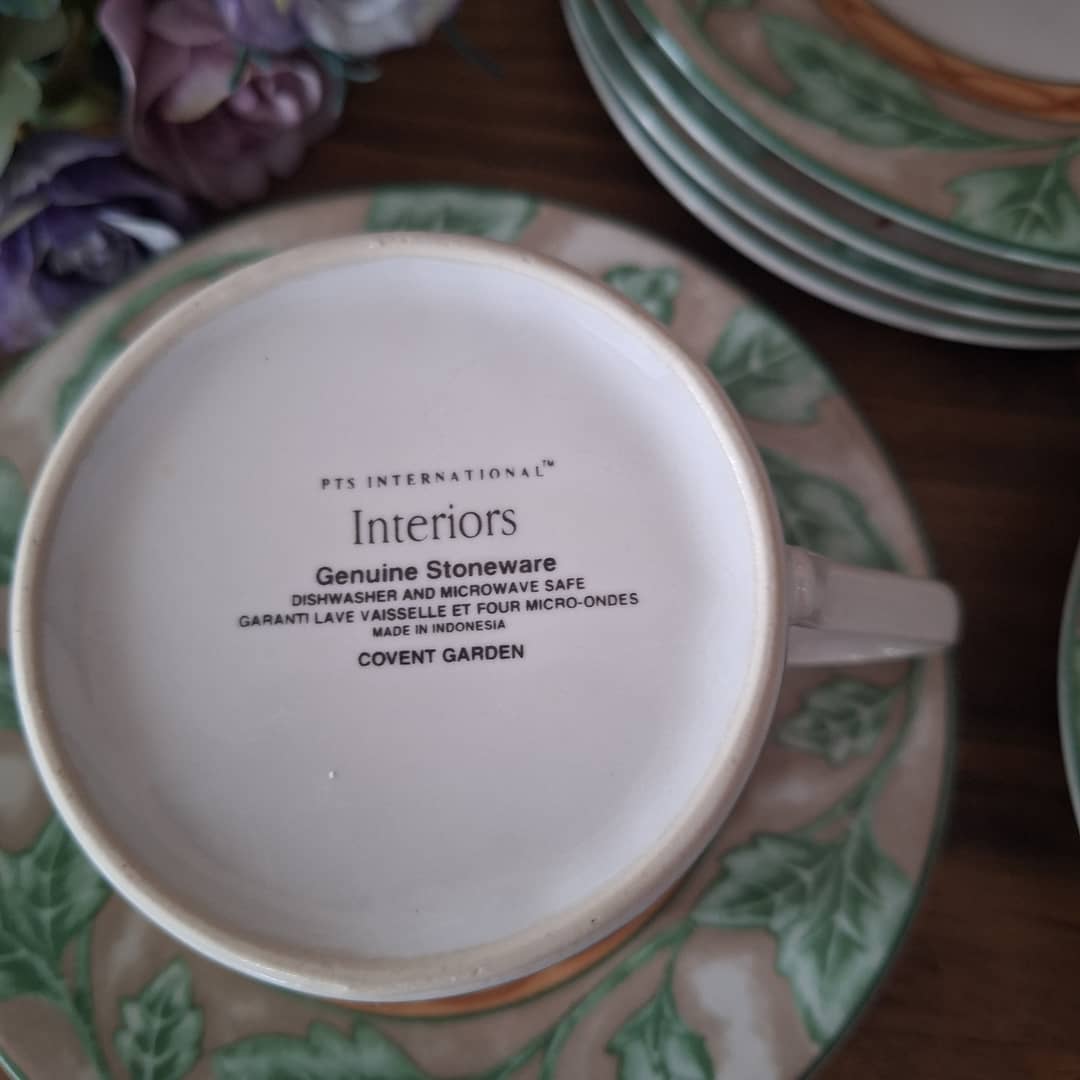 Dwie filiżanki, większa i mniejsza plus 4 talerzyki. Zestaw wyprodukowany w Indonezji z prawdziwej kamionki. Można myć w zmywarce i używać w kuchence mikrofalowej. Możliwy dowóz lub wysyłka, cena 60 zł.