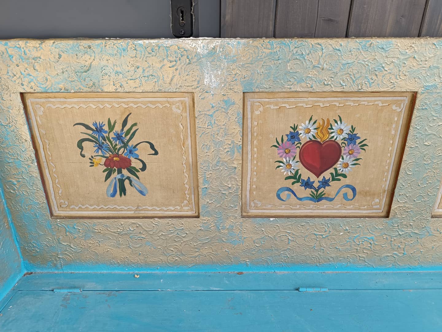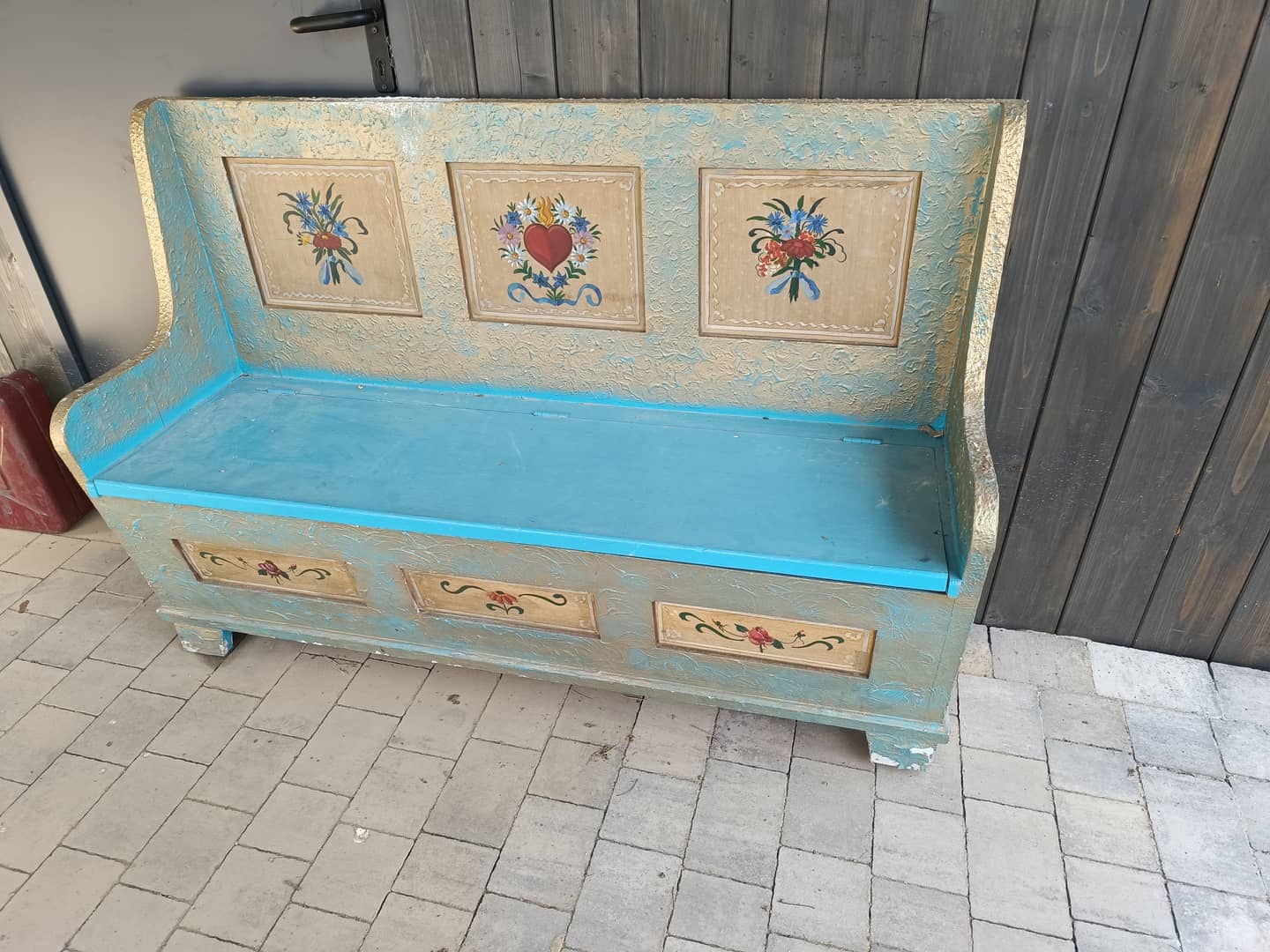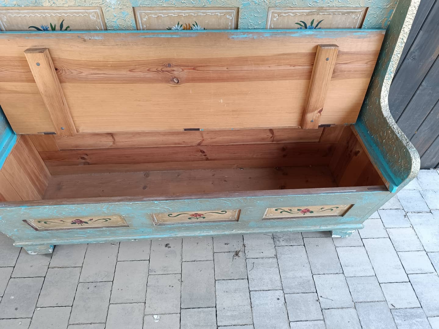 Piękna zabytkowa drewniana otwierana ława ze schowkiem. Stan bardzo dobry. Długość 144 cm, wysokość z oparciem 94cm. Jak widać na zdjęciach nóżki mogą wymagać odnowienia. W środku bardzo czysta, zdrowe drewno. Odbiór wyłącznie osobisty Jelenia Góra. Cena 1400.