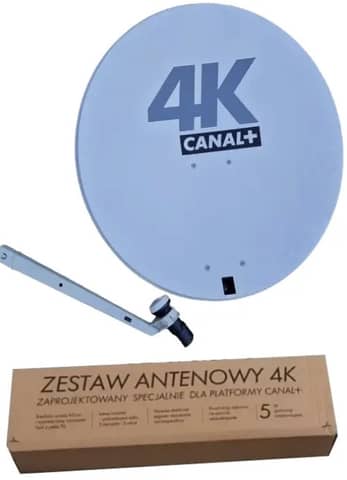 Nowy satelitarny zestaw antenowy marki Canal+ składający się z talerza, konwertera, regulowanego ramienia oraz niezbędnych środków mocujących.
