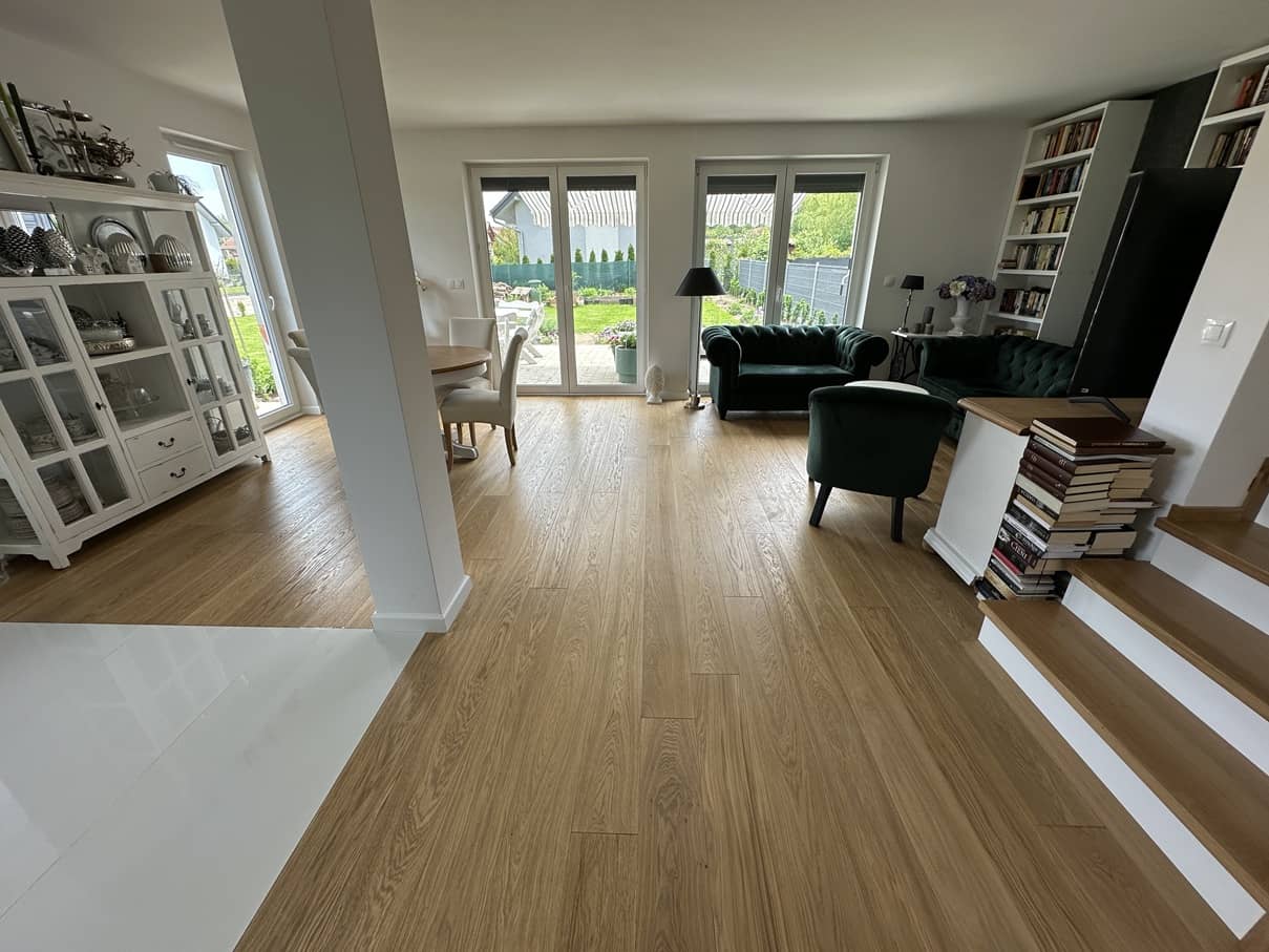 - na podłogach w całym domu deska drewniana dębowa