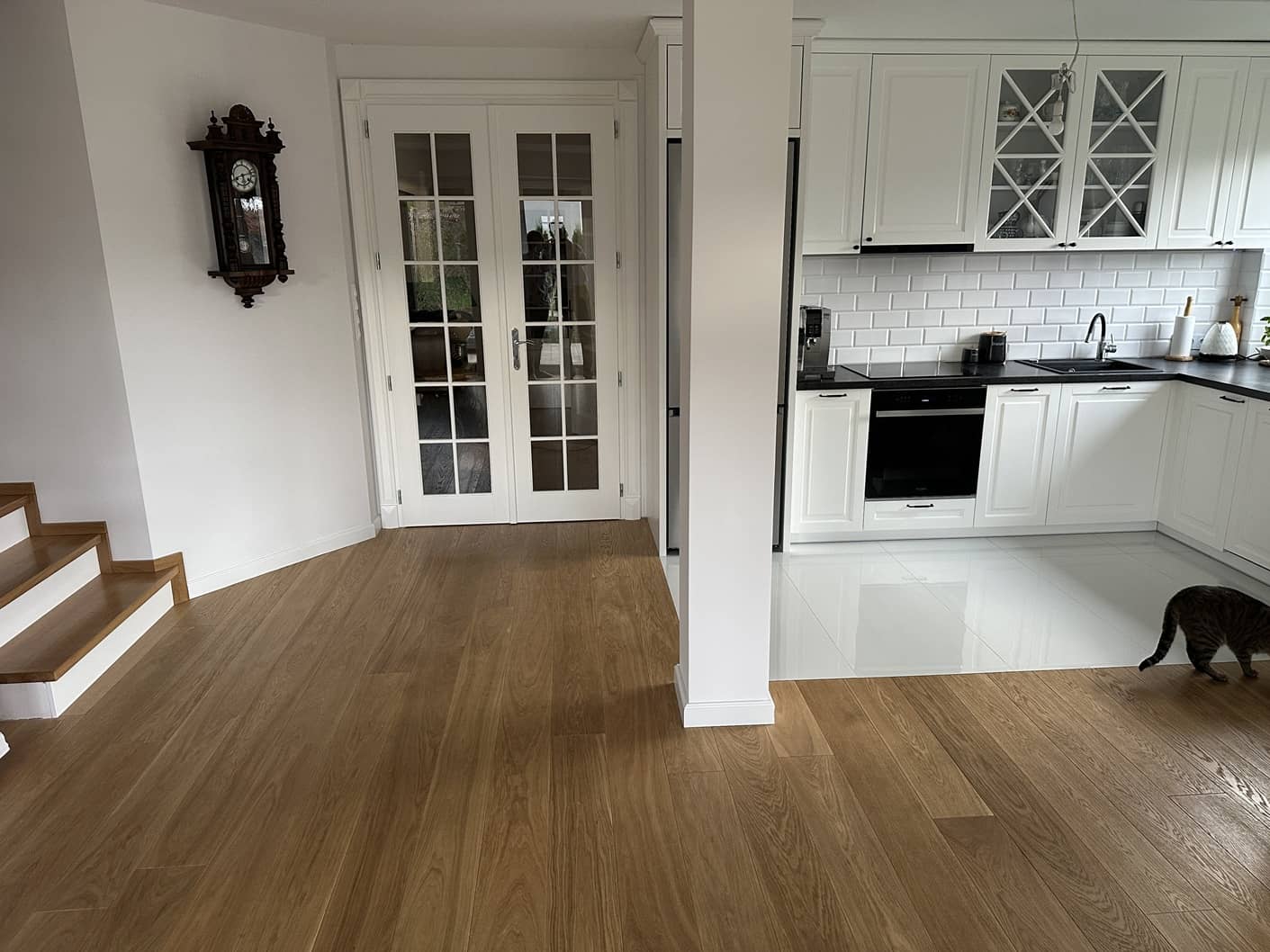 - dębowa okładzina schodów prowadzących na piętro