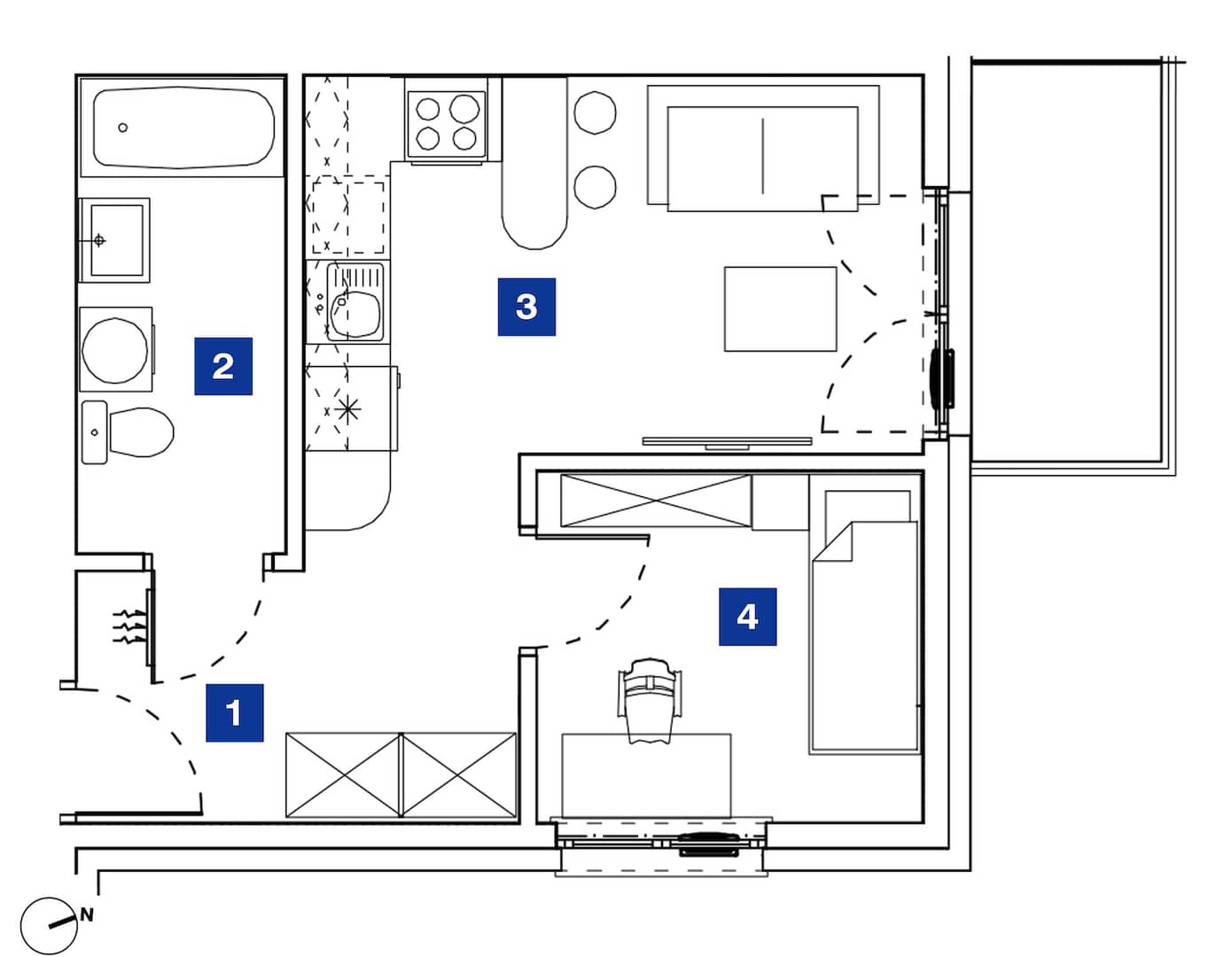 Na powierzchnię 30,62m2 składają się - pokój z aneksem kuchennym (16,09m2), pokój (6,84m2), łazienka (5,04m2) i przedpokój (2,65m2).