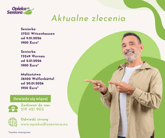 Opiekunka do starszego Małżeństwa 38302 Wolfenbüttel/ Dolna Saksonia Od 20.01.2026 do 1950 EURO + opłacony przejazd Wymagania: -komunikatywna znajomość języka niemieckiego tel.: