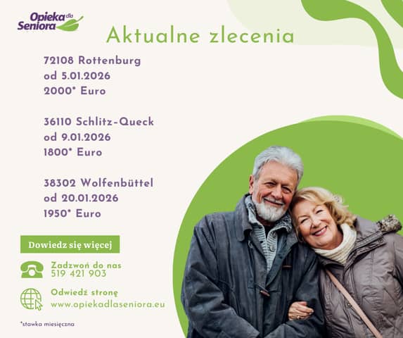 Opiekunka do starszego Małżeństwa 38302 Wolfenbüttel/ Dolna Saksonia Od 20.01.2026 na 8 tygodni 1950 EURO + opłacony przejazd Wymagania: -komunikatywna znajomość języka niemieckiego