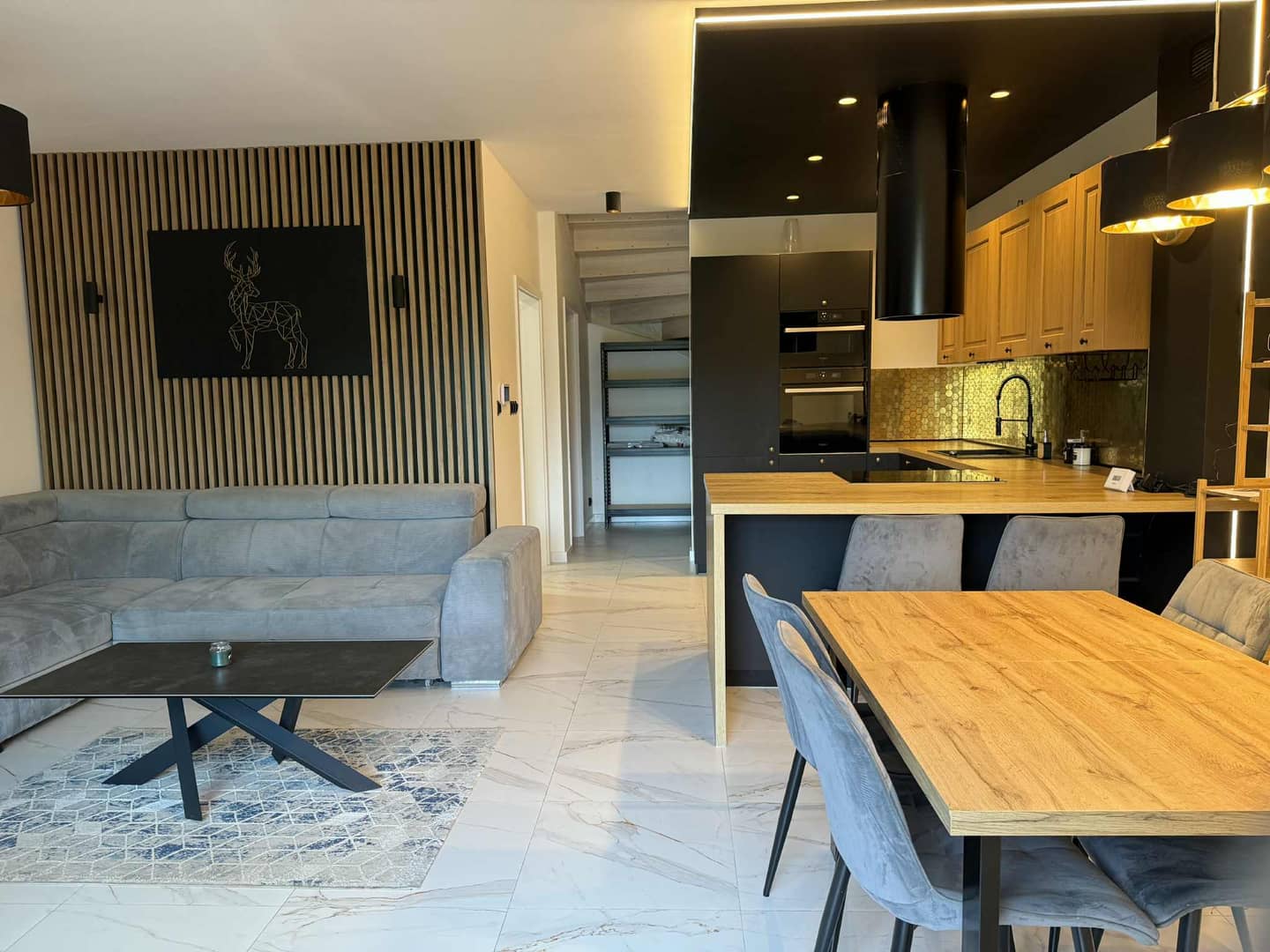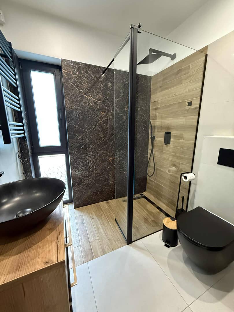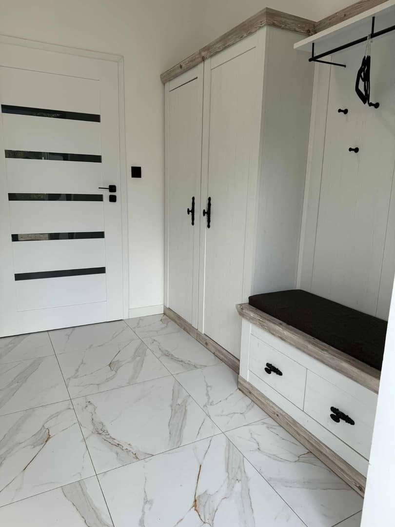 Na podłogach kafle i panele winylowe wysokiej jakości w zależności od strefy przeznaczenia.