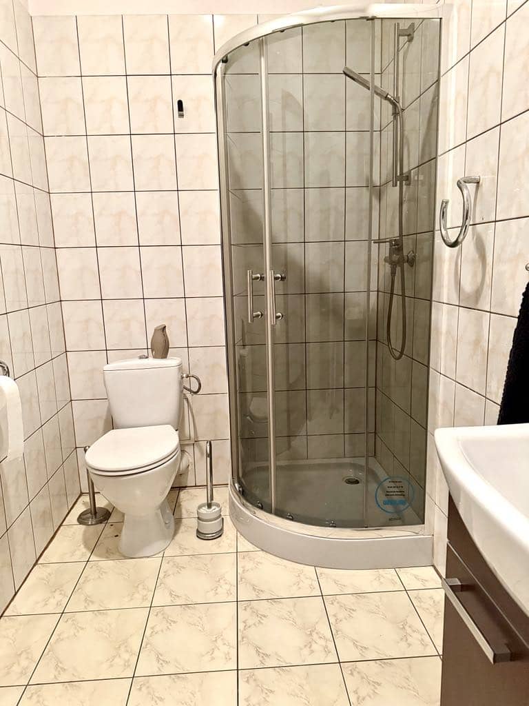 Łazienka z WC wyposażona jest w kabinę prysznicową, umywalkę i szafki widoczne na zdjęciu.