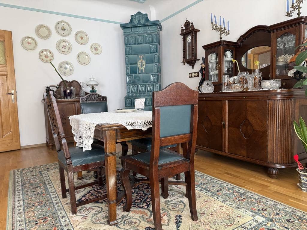 posiada niezwykłe ozdobne piece kaflowe, na podłogach położony został parkiet oraz płytki z zależności od strefy użytkowania.