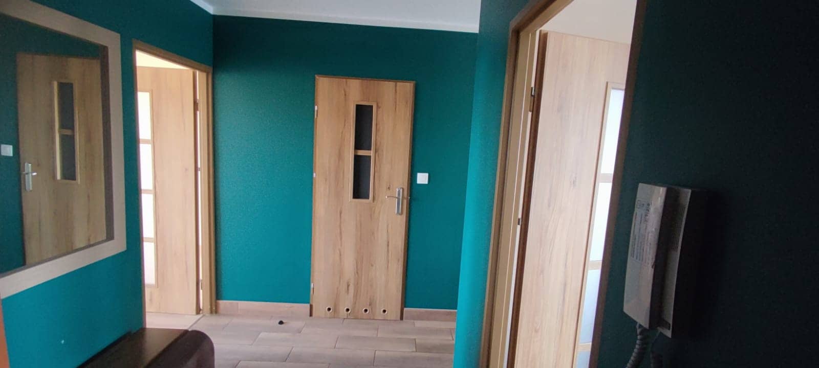 • Podłogi: panele w pokojach, płytki w kuchni i przedpokoju
