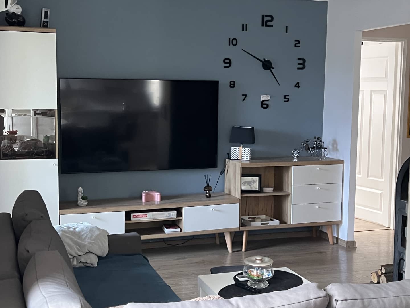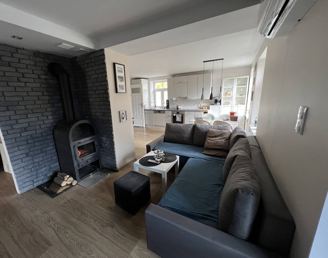 W salonie kominek na drewno, klimatyzacja