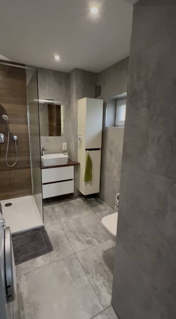 Łazienka z prysznicem i ogrzewaniem podłogowym.