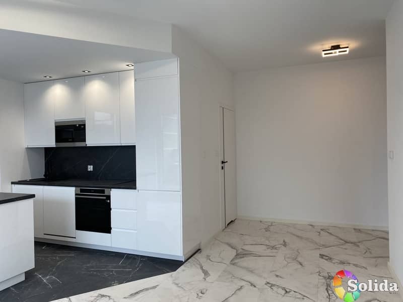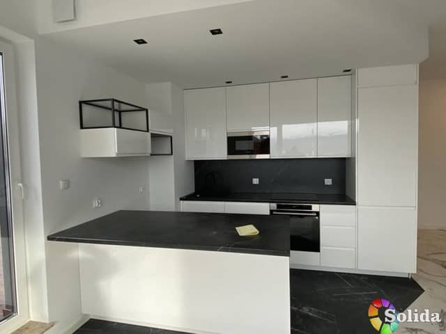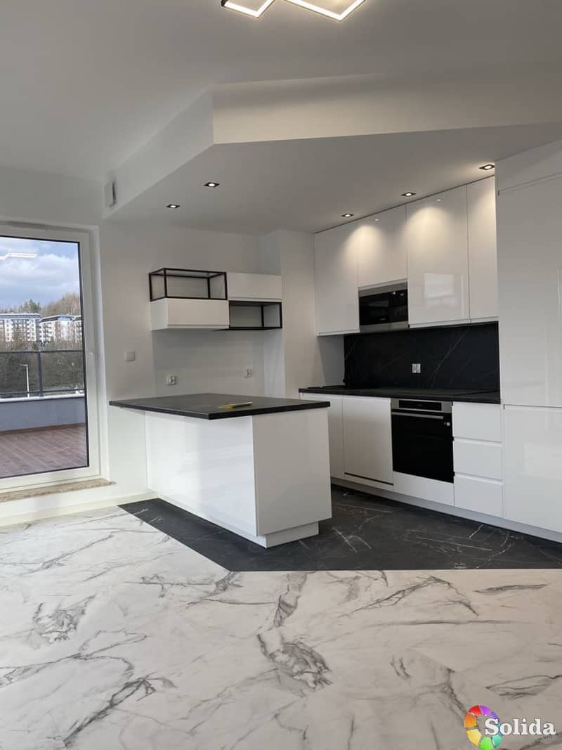 Aneks kuchenny wyposażony w nowe meble i sprzęt AGD, tj. lodówka i zamrażarka w zabudowie, zmywarka, mikrofalówka,