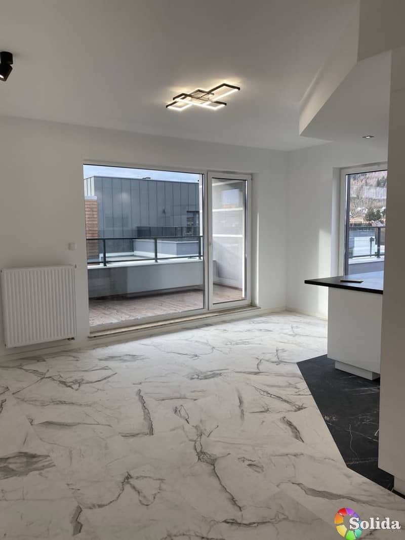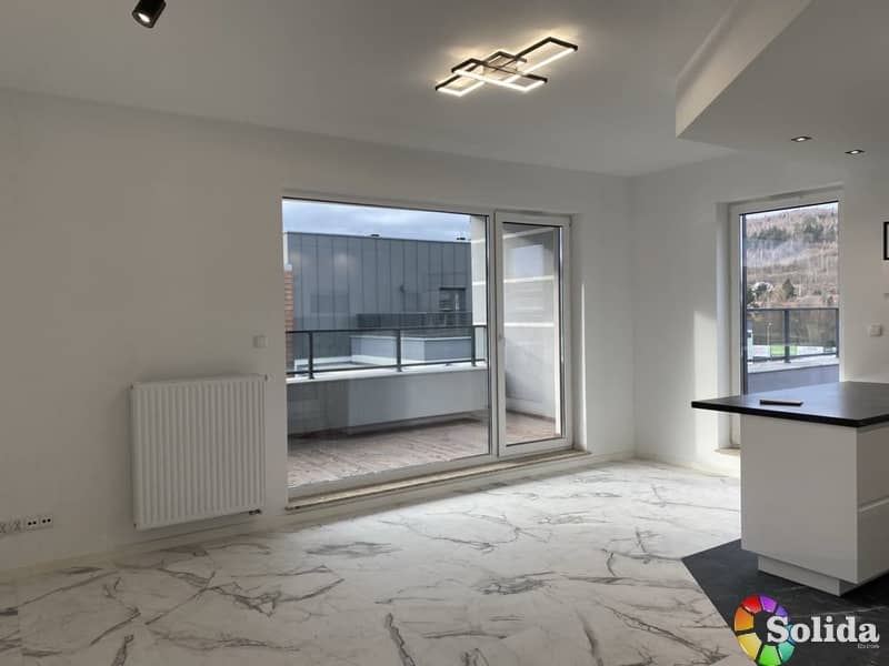 również z wyjściem na mniejszy taras od strony sypialni oraz z drugim wyjściem na kolejny duży taras wykończony.