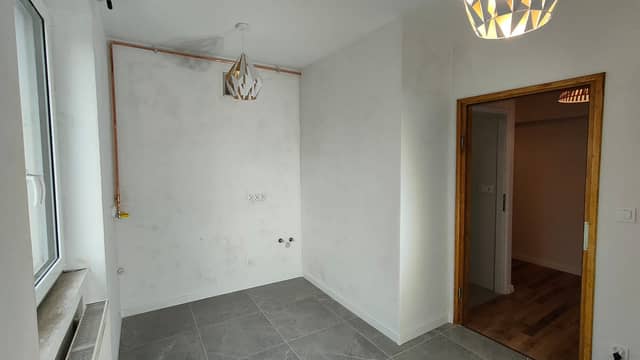 Na podłogach znajdują się panele i kafle, stolarka okienna PCV.