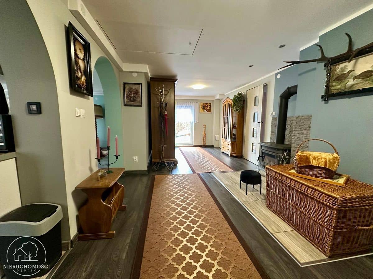 przestronnego przedpokoju z kominkiem i wyjściem na taras,