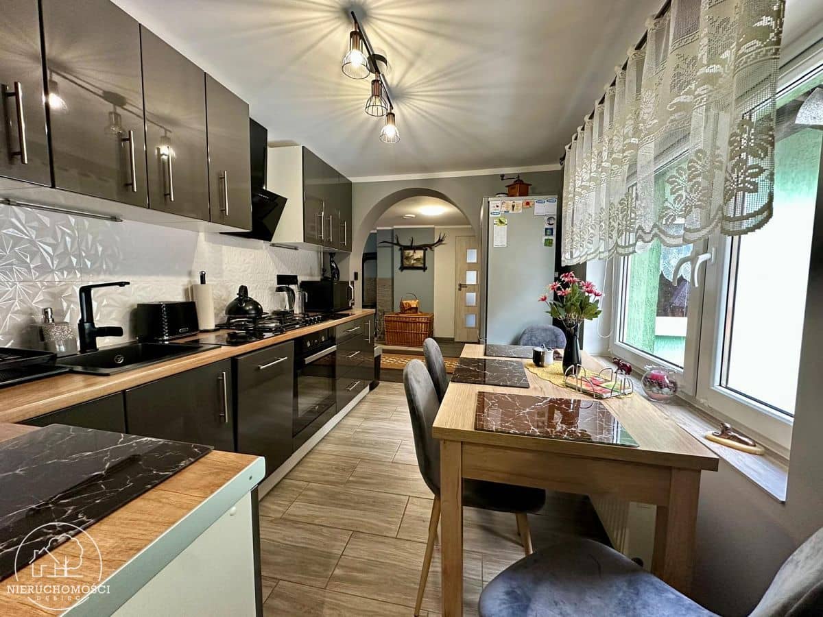 W kuchni nowa zabudowa meblowa wykonana na wymiar oraz wysokiej jakości sprzęty AGD..