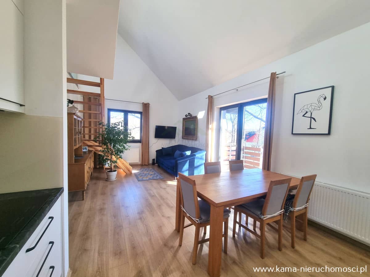 - salon z aneksem kuchennym i z wyjściem na zadaszony balkon