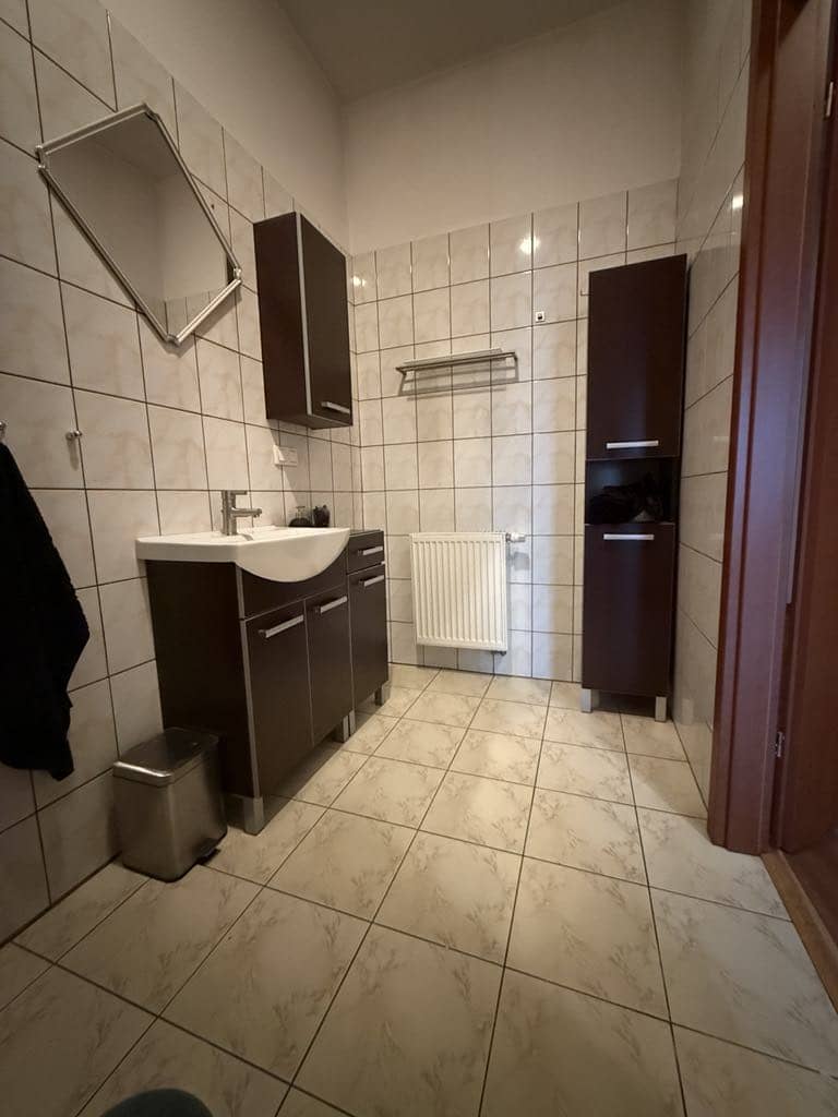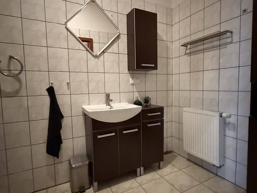 Łazienka z WC wyposażona jest w kabinę prysznicową, umywalkę i szafki widoczne na zdjęciu.