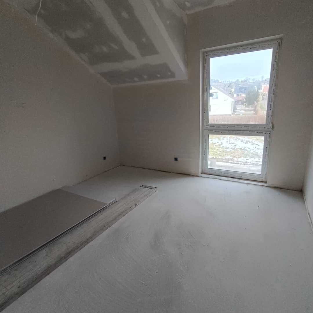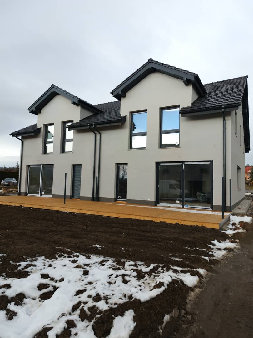Nowy Dom w zabudowie bliźniaczej w Jeżowie Sudeckim. Posadowiony na działce 347 m2, budowany z Ytonga , ocieplony, wykończony tynkiem gtafit, dach pokryty dachówką ceramiczną. Projekt " Dom w Kupidynkach". Powierzchnia całkowita wynosi 150 m2 i obejmuje na parterze wiatrołap, hall, salon z jadalnią i kuchnią, z wyjściem na taras, pokój - gabinet, łazienkę, spiżarnię oraz garaż. Piętro to korytarz, 4 pokoje w tym jeden z garderobą, łazienka, oraz pom. gospodarcze. Stan deweloperski, podłączone i rozprowadzone instalacja elektryczna, wodno - kanalizacyjna. Rekuperacja, pompa ciepła z rekuperatorem, ogrzewanie podłogowe w całym budynku. Wylane posadzki przygotowane pod położenie podłóg, ściany pokryte tynkami kategori trzeciej, okna pcv trzy szybowe. Przed budynkiem na podjeździe położona kostka, drewniany taras od strony ogrodu, całość będzie ogrodzona. Z piętra widok na pobliskie góry Karkonosze. Atrakcyjna lokalizacja w centralnej części miejscowości, gdzie znajdują się sklepy, market, szkoła, przedszkole, ośrodek zdrowia, komunikacja miejska, a zarazem w bliskiej odległości terenów zielonych, szlaków spacerowych. Cena 890 000 zł. Bardzo atrakcyjna oferta, serdecznie polecam i zapraszam na prezentację