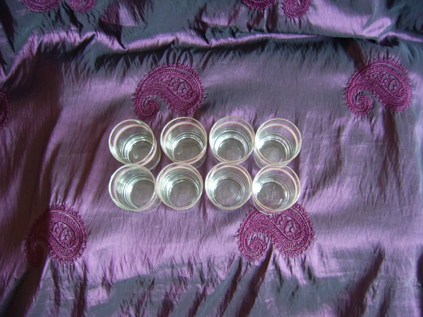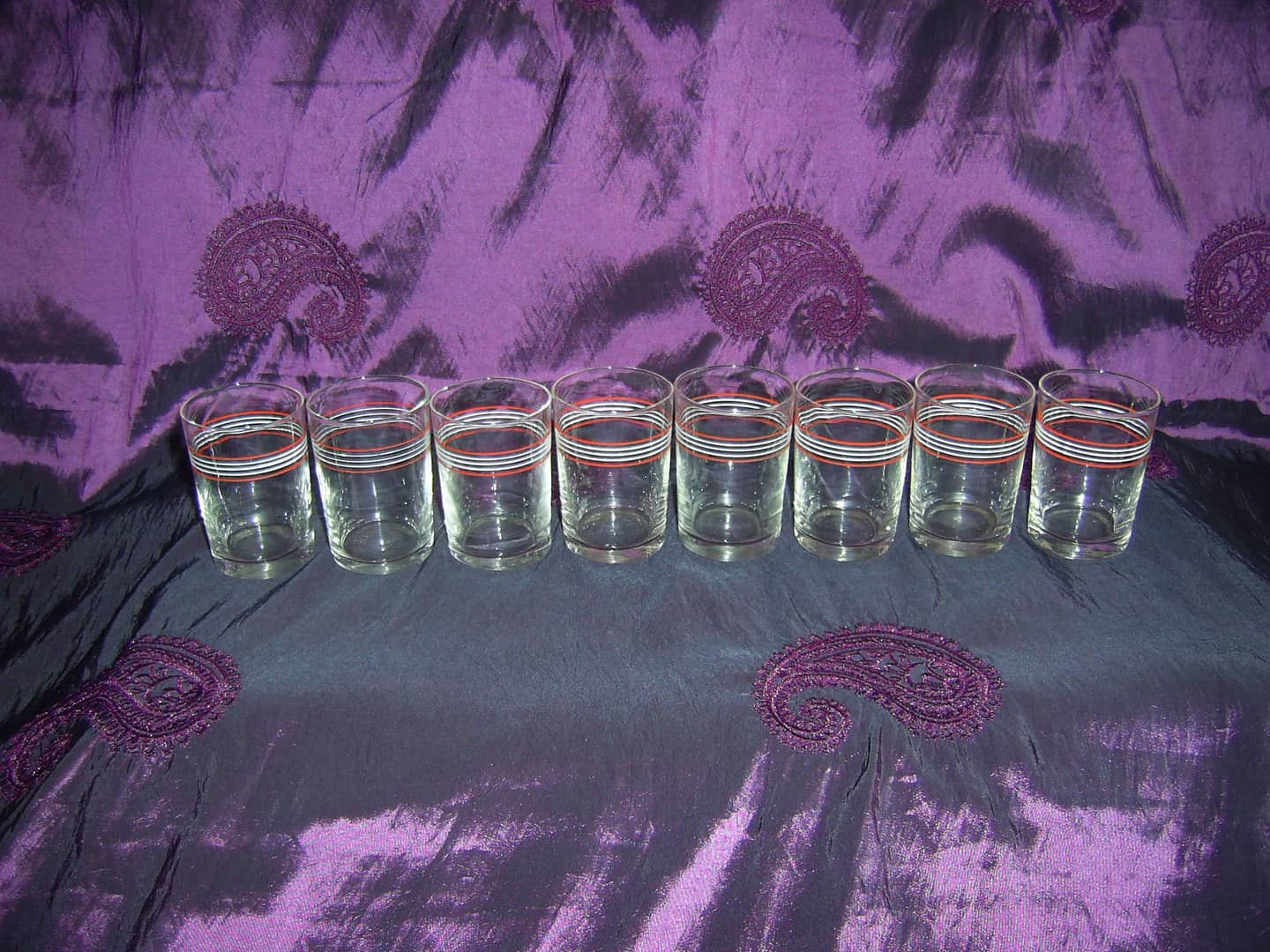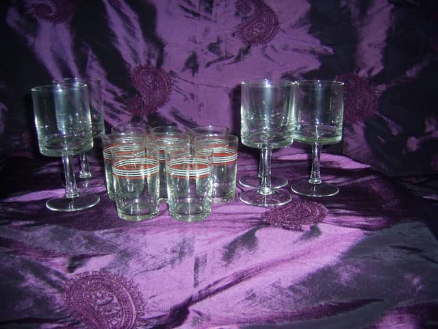 Zestaw składający się z 5 kieliszków do wina z lat oraz 8 kieliszków do wódki tak zwanych setek ze szkła. Posiadają niewielkie oznaki od przechowywania/użytkowania. Jeden kieliszek od wina posiada wadę w postaci niewielkiego uszczerbku szkła a jeden z kieliszków do wódki posiada w szkle bąbelek powietrza (widoczne na dwóch ostatnich zdjęciach). 30 zł.
