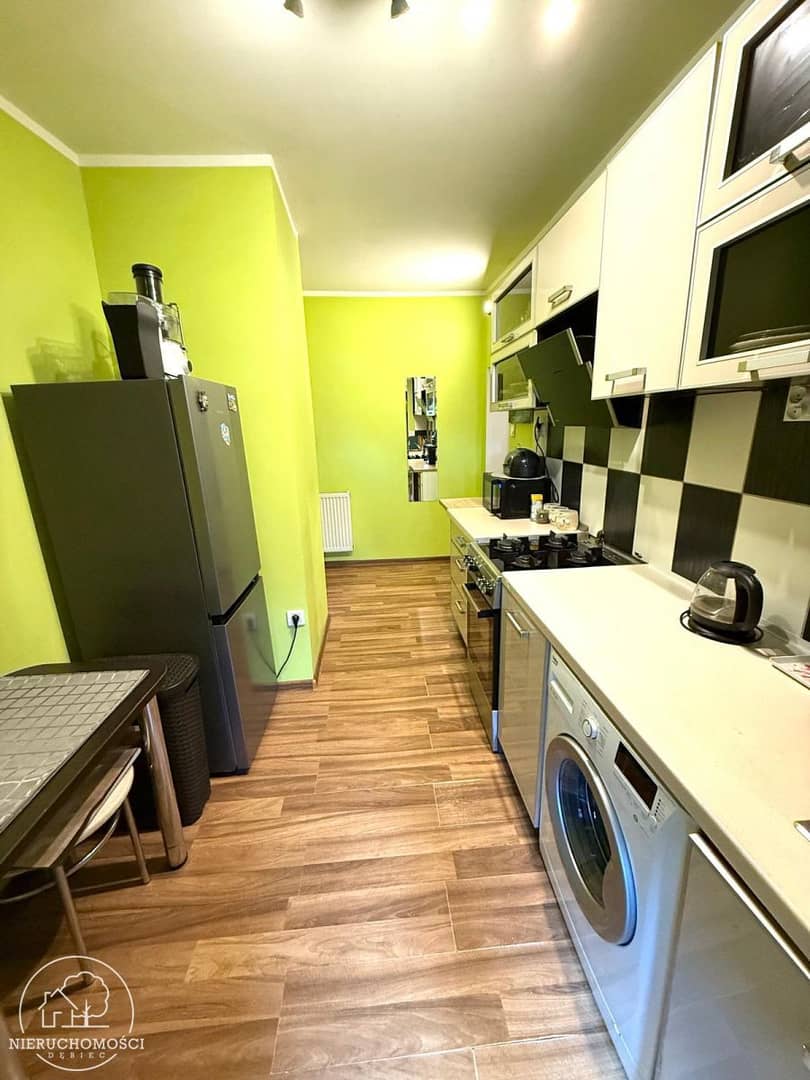 W kuchni pozostaje sprzęt AGD: zmywarka, kuchenka gazowa, lodówka, pralka, mikrofalówka.