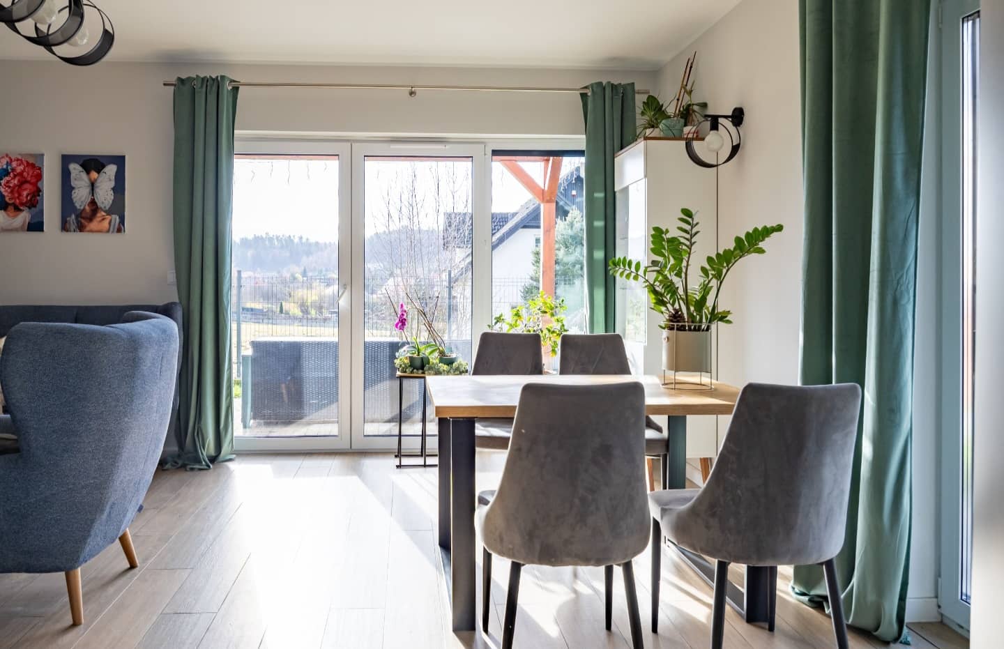 przestronny, jasny salon z aneksem kuchennym i jadalnią,