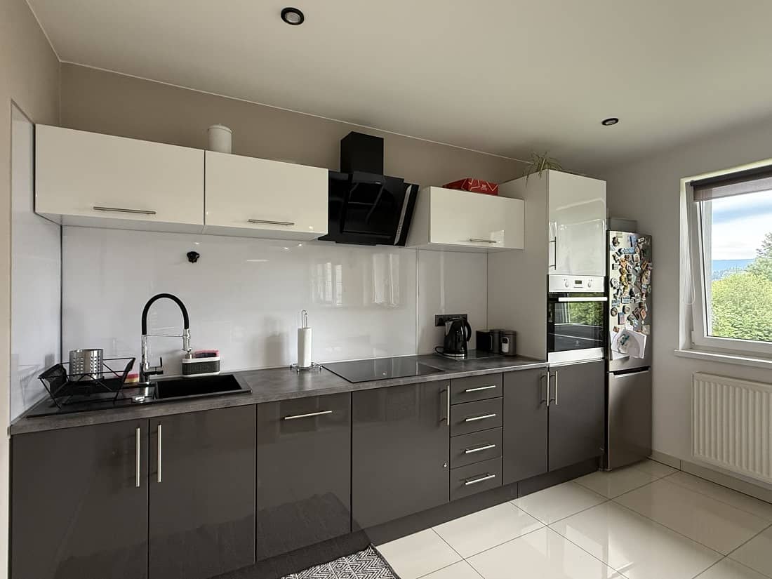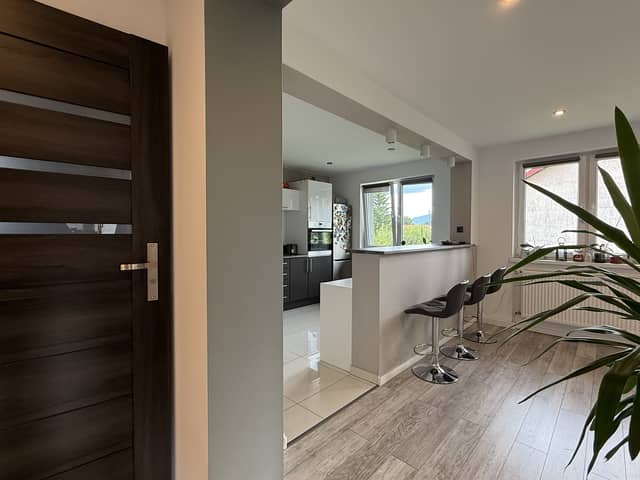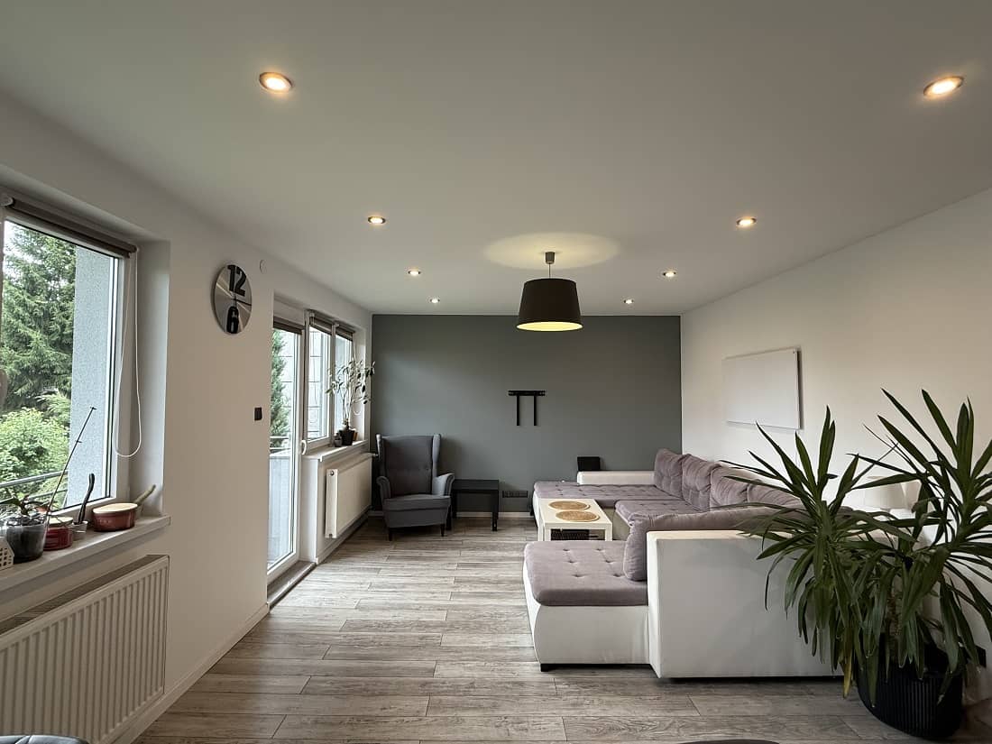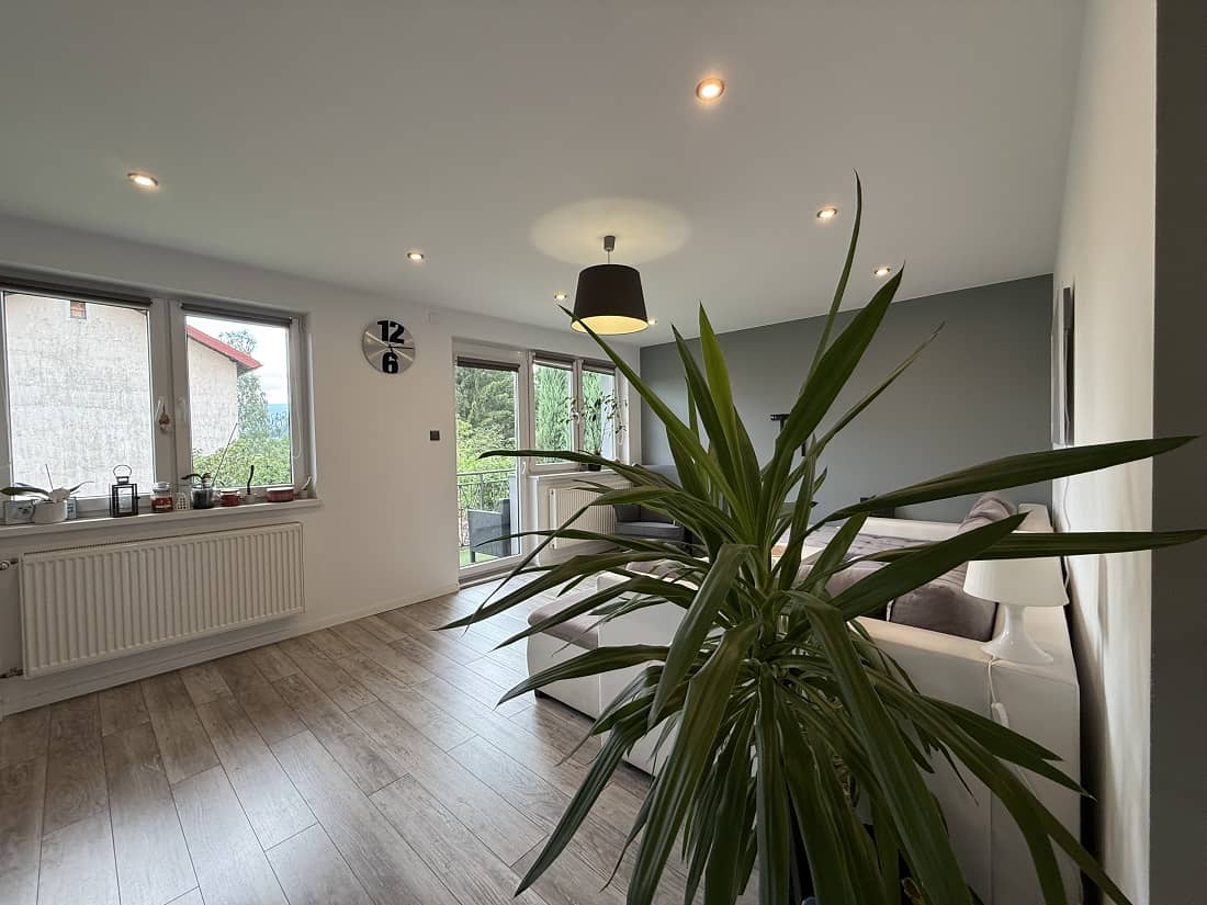 • duży salon z aneksem kuchennym i wyjściem na balkon