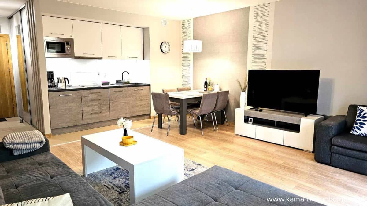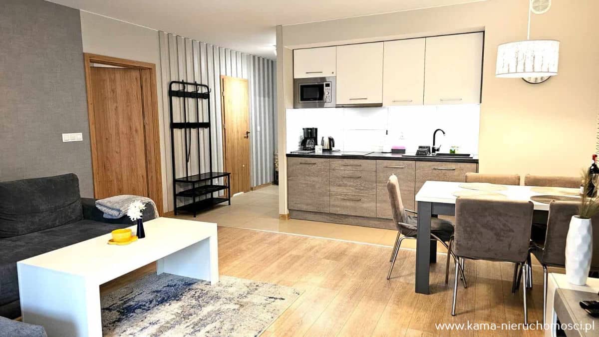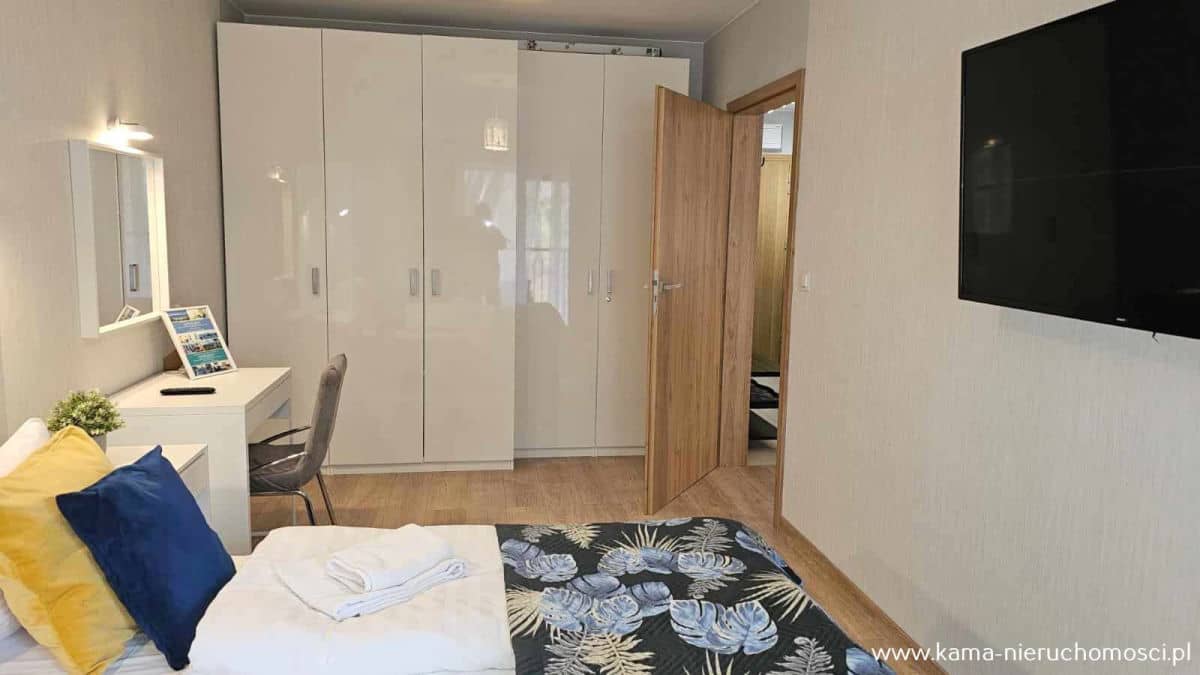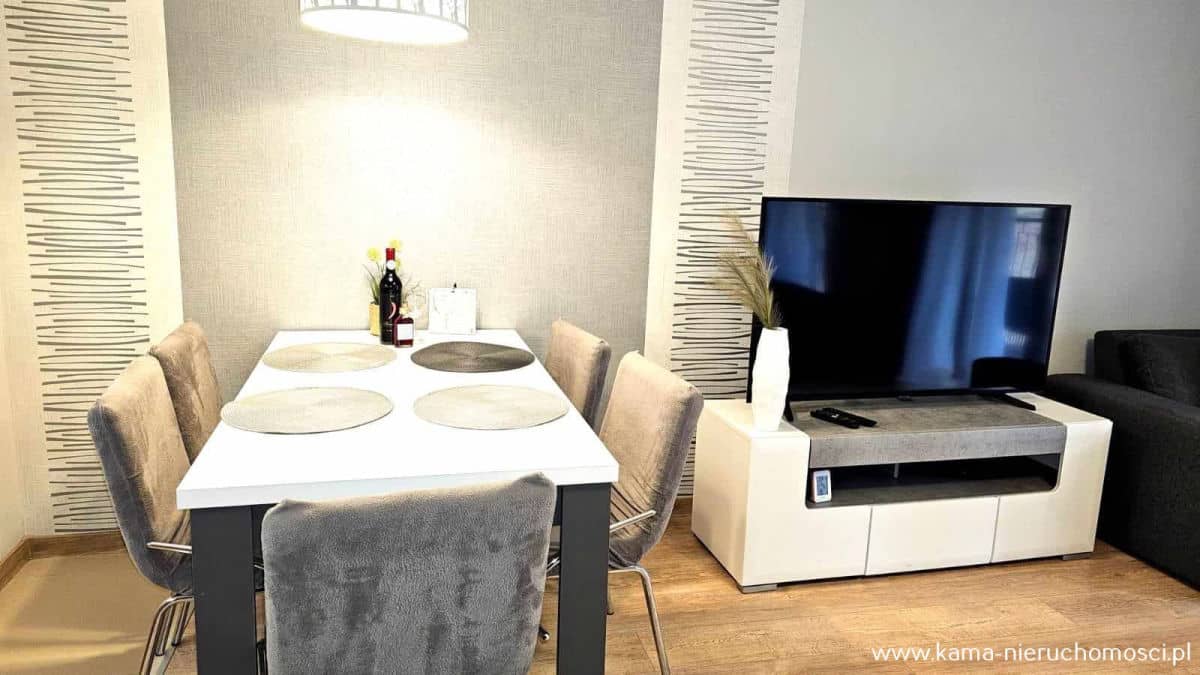 Apartament bardzo ładnie urządzony sprzedawany jest z całym umeblowaniem i wyposażeniem.