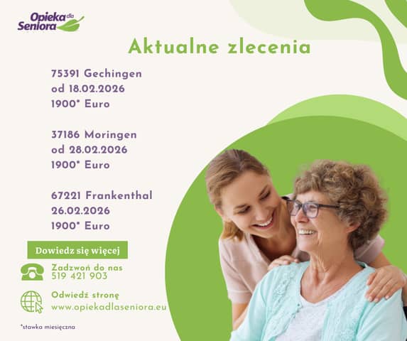 Opiekunka do starszej Pani 67221 Frankenthal/ Nadrenia-Palatynat Od 26.02.2026 do 1900 EURO + opłacony przejazd Wymagania: - dobra znajomość języka niemieckiego tel.: 519421903 / 6903