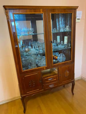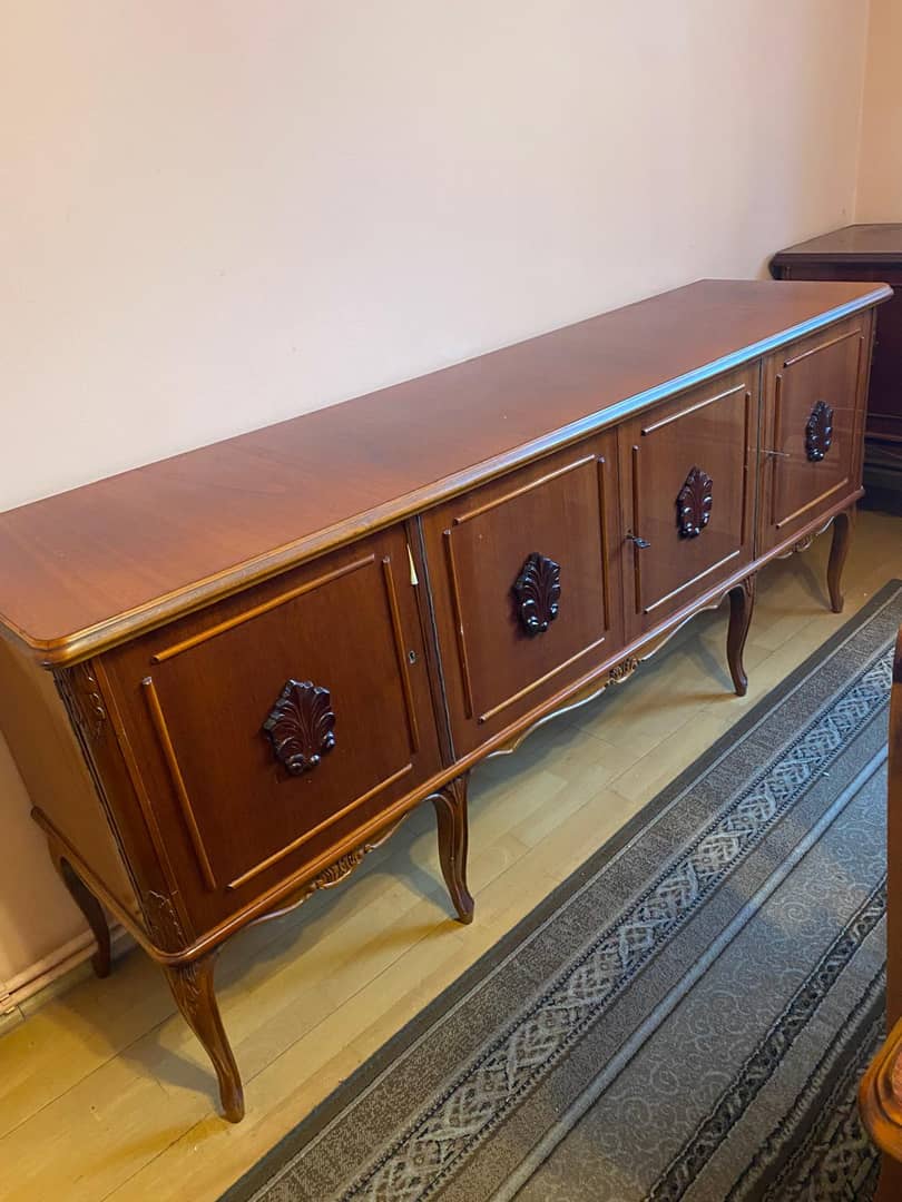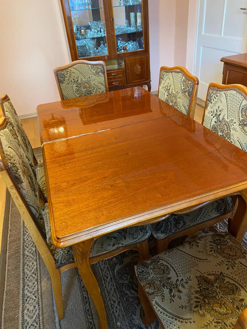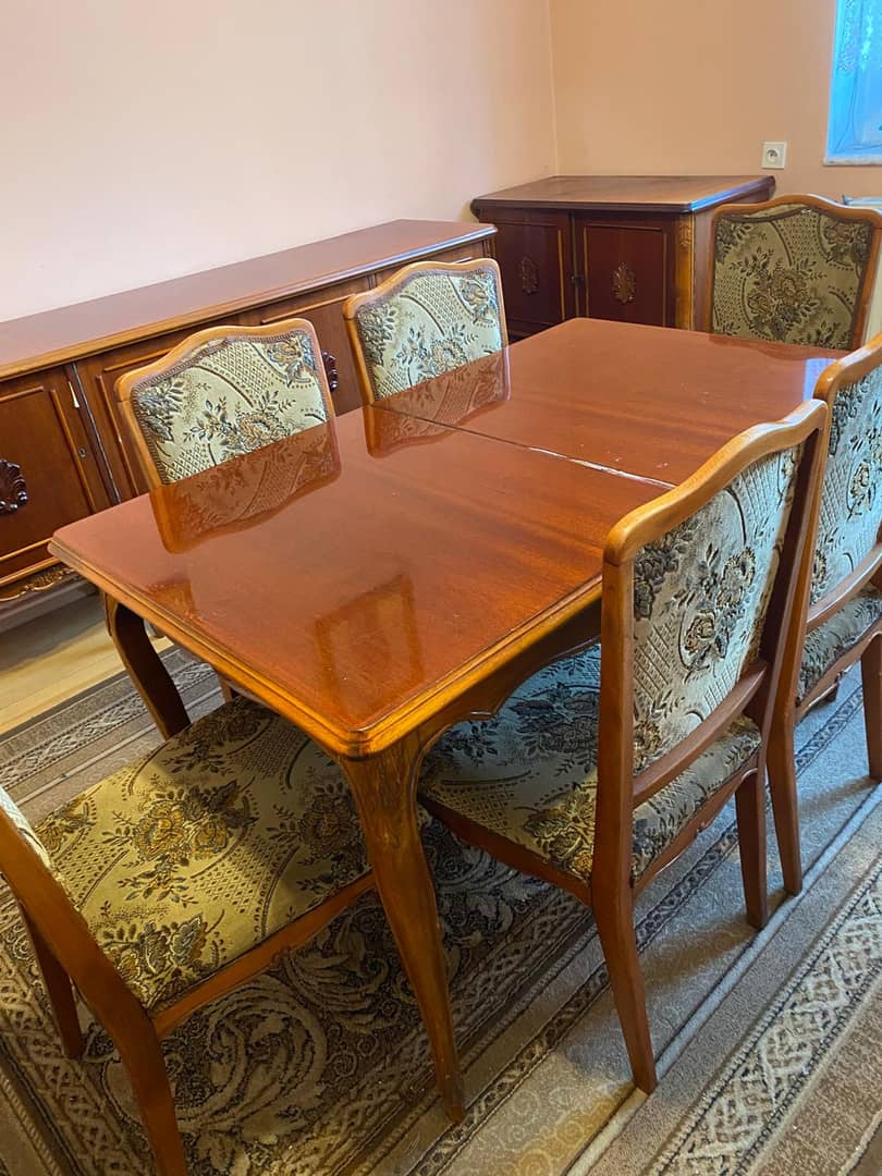 Sprzedam meble z lat 80. W zestawie znajdują się: szafka mała, szafka długa, witrynka, stół i 6 krzeseł. Cena zestawu to 5000 zł. Więcej informacji udzielę telefonicznie.