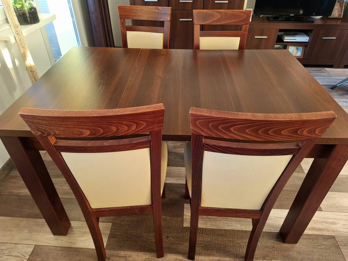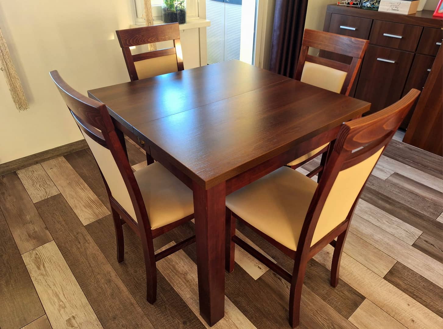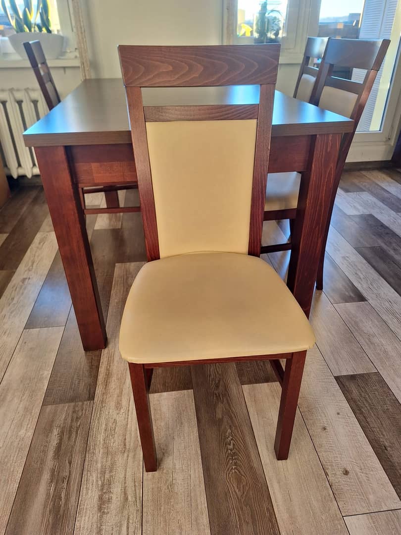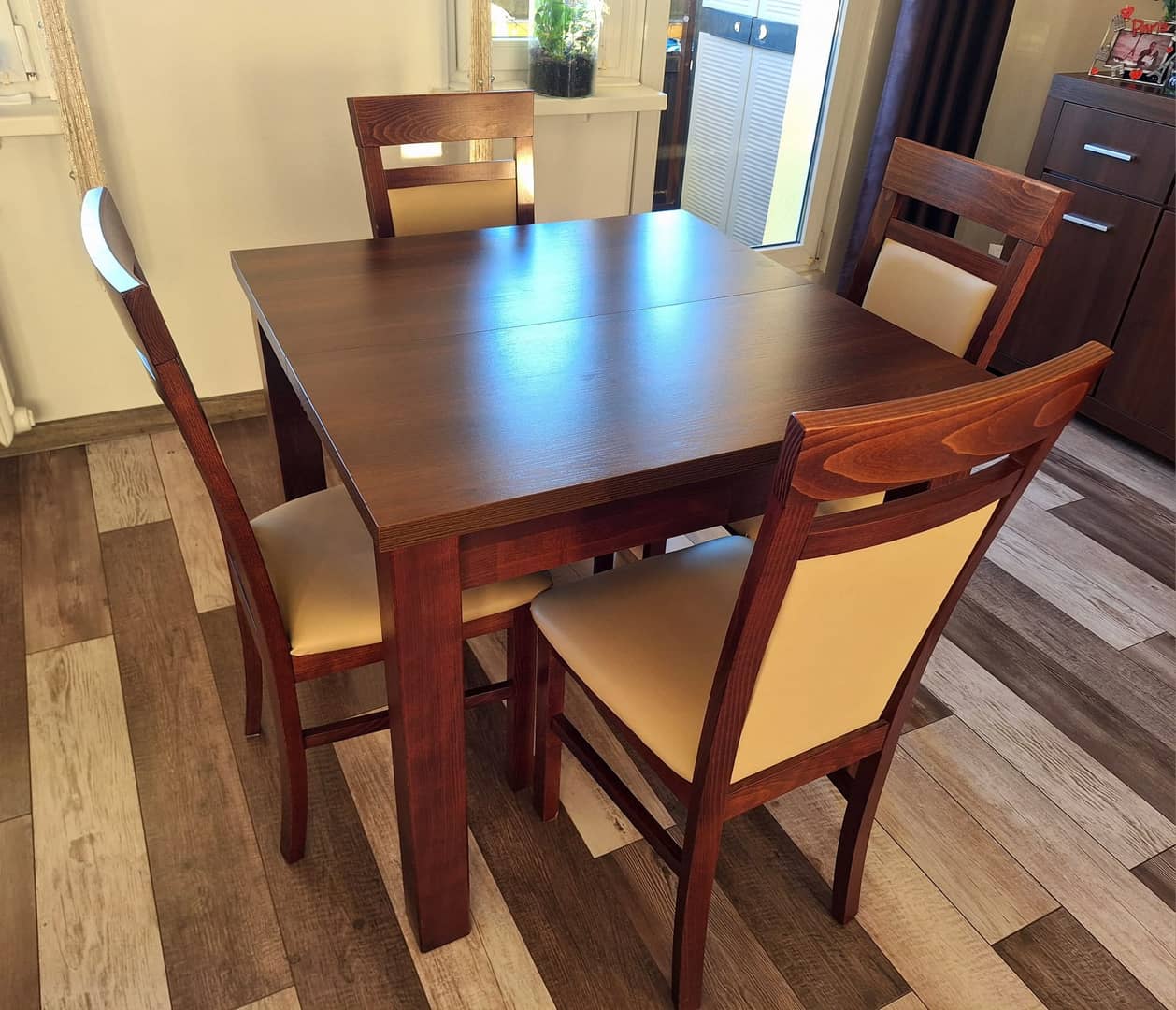 Sprzedam solidny rozkładany stół z czterema wygodnymi ktzesłami. Stan bardzo dobry(kilka drobnych zarysowań). Wymiary po złożeniu 90x90cm. Dodadkowo 4 wkładki, każda po 50cm, maksymalny wymiar po rozłożeniu to 90x290cm. Wysokość całkowita 78cm.