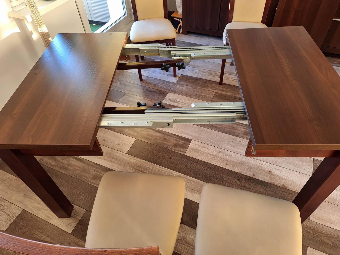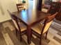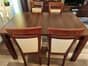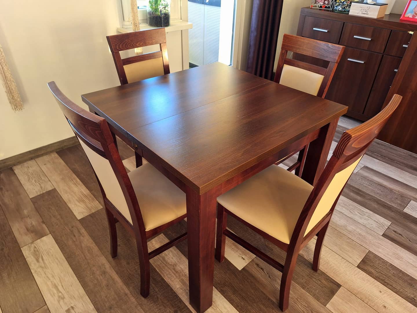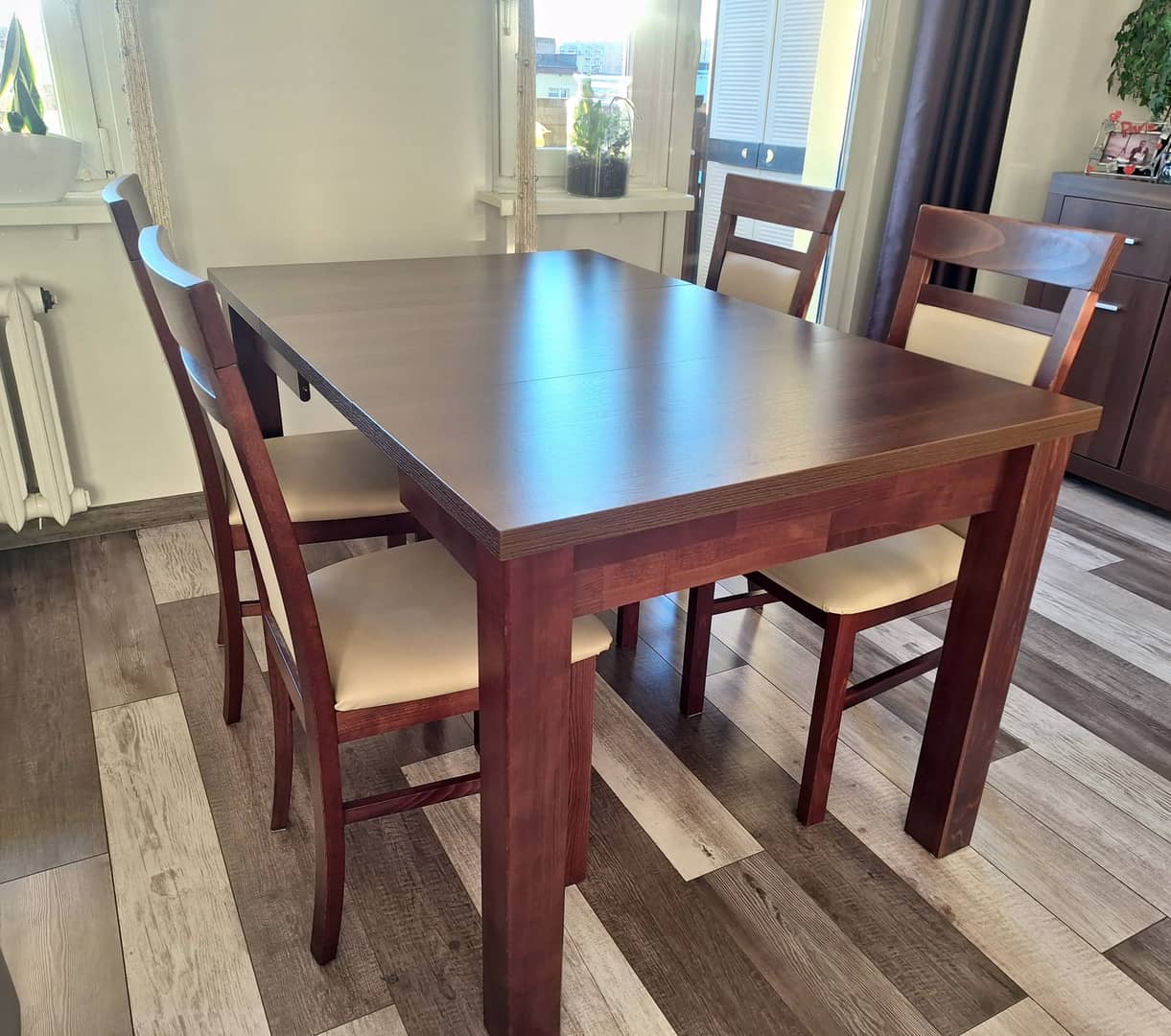 Sprzedam solidny rozkładany stół z czterema wygodnymi krzesłami. Wymiary po złożeniu 90x90. Dodatkowo 4 wkładki po 50cm każda, maksymalny rozmiar po rozłożeniu to 90x290cm. Wysokość całkowita 78cm.