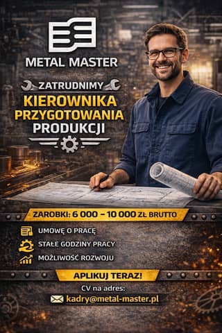 Metal-Master Sp. z o.o., firma produkcyjna z siedzibą w Podgórzynie, zatrudni Kierownika Produkcji.