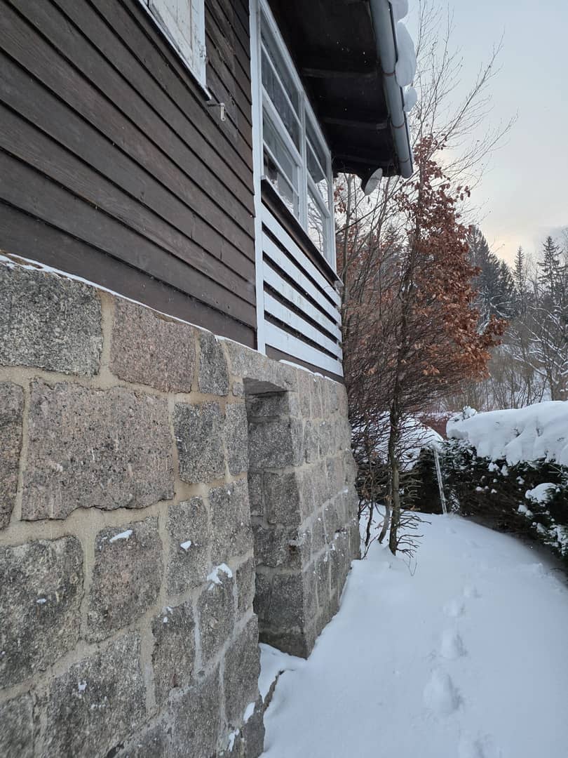 Dom posadowiony na kamiennym fundamencie, konstrukcja drewniana, od wewnątrz wyłożony cegłą.