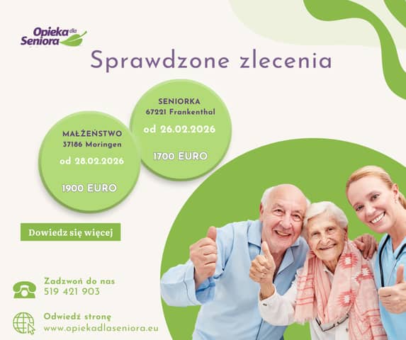 Opiekunka do starszej Pani 67221 Frankenthal/ Nadrenia-Palatynat Od 26.02.2026 do 1900 EURO + opłacony przejazd Wymagania: - dobra znajomość języka niemieckiego tel.: 572366022 Infor
