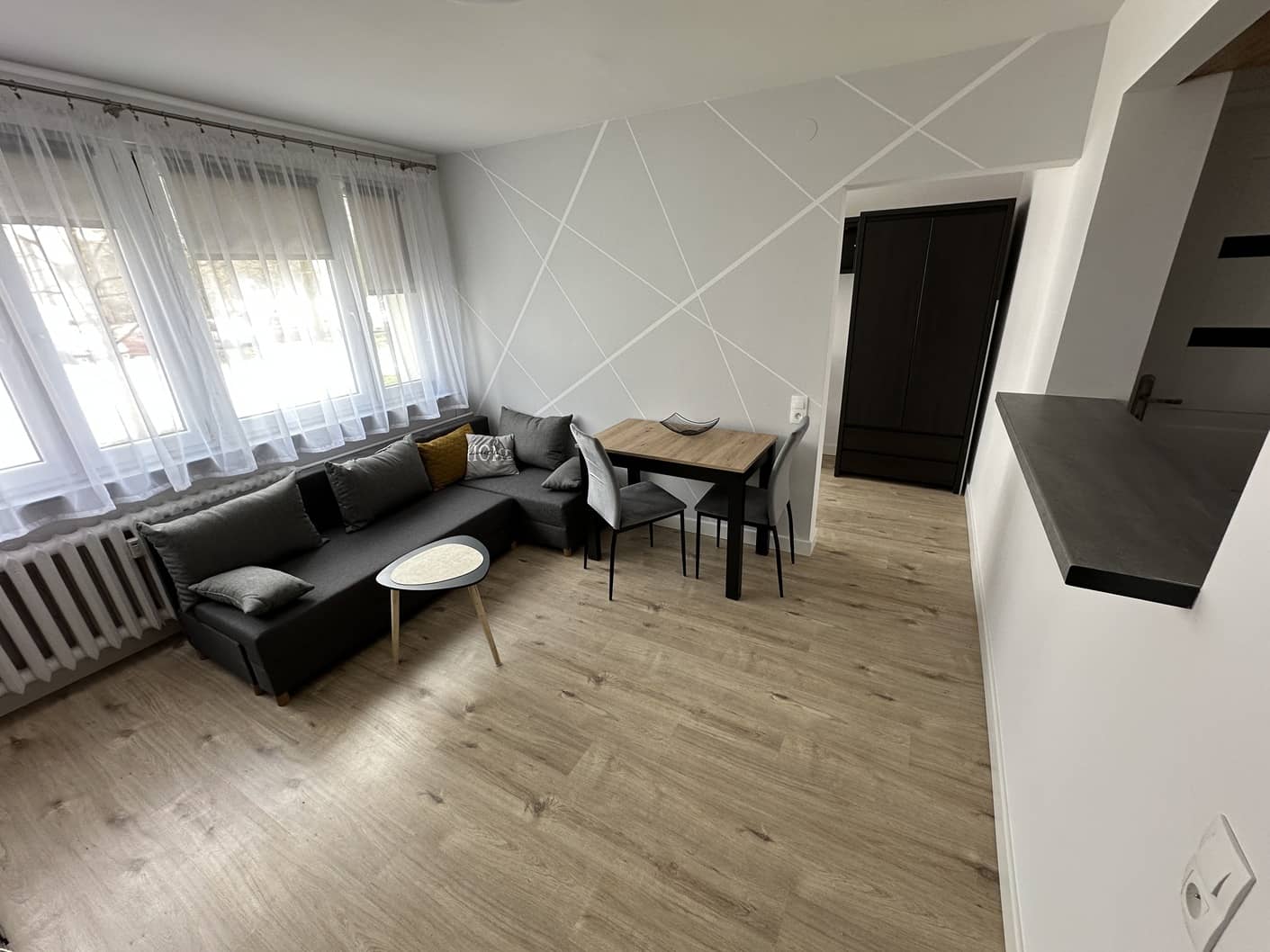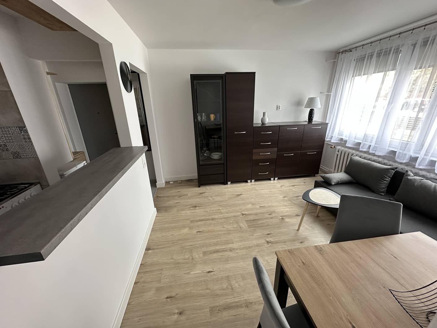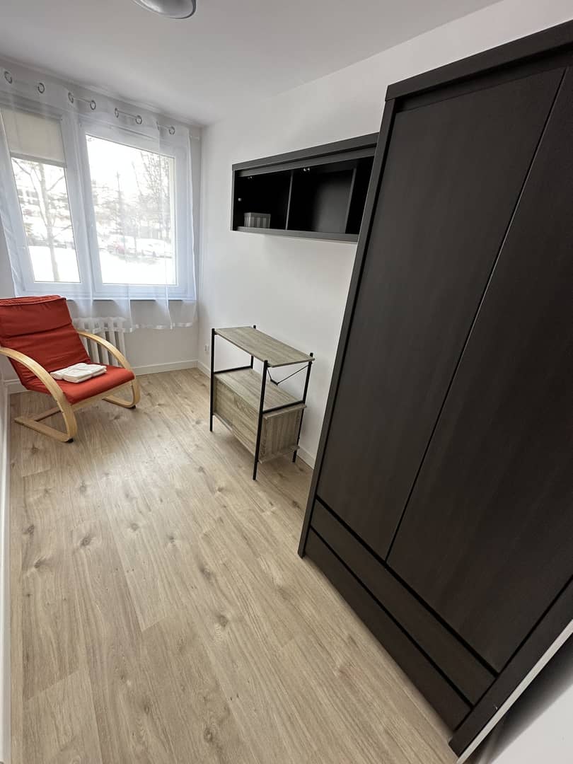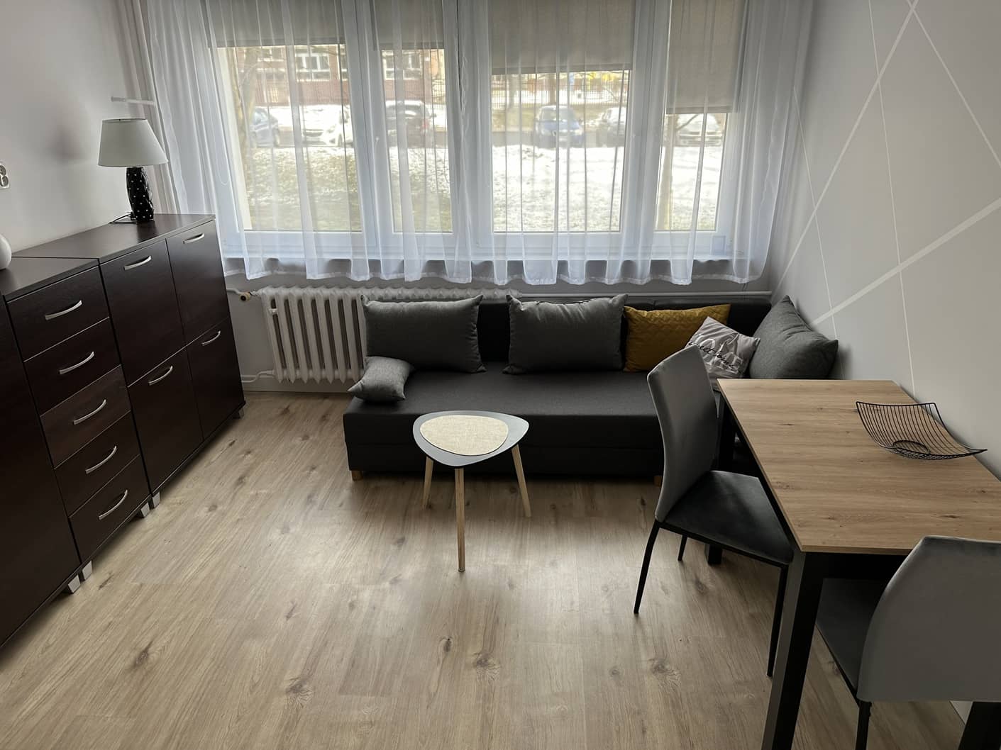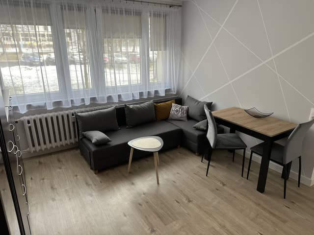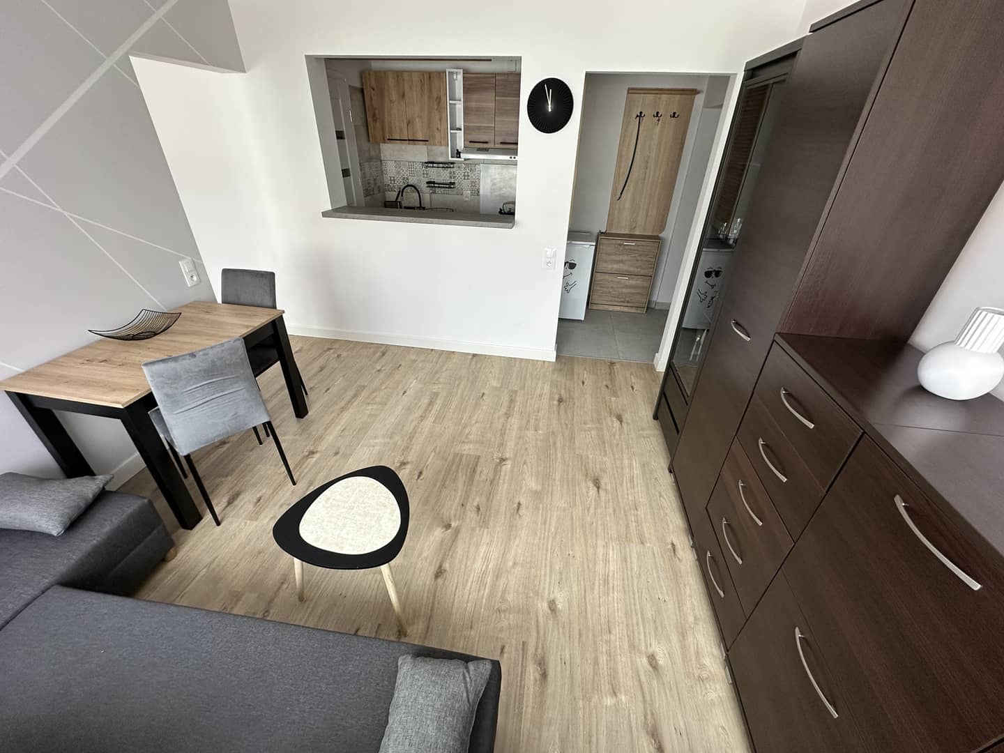 Mieszkanie: duży salon z aneksem kuchennym, duży przedpokój, łazienka, Na wyposażeniu szafa, komoda, narożnik z funkcją spania, fotel jednoosobowy do spania, komoda, meble kuchenne, zmywarka, k