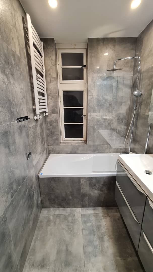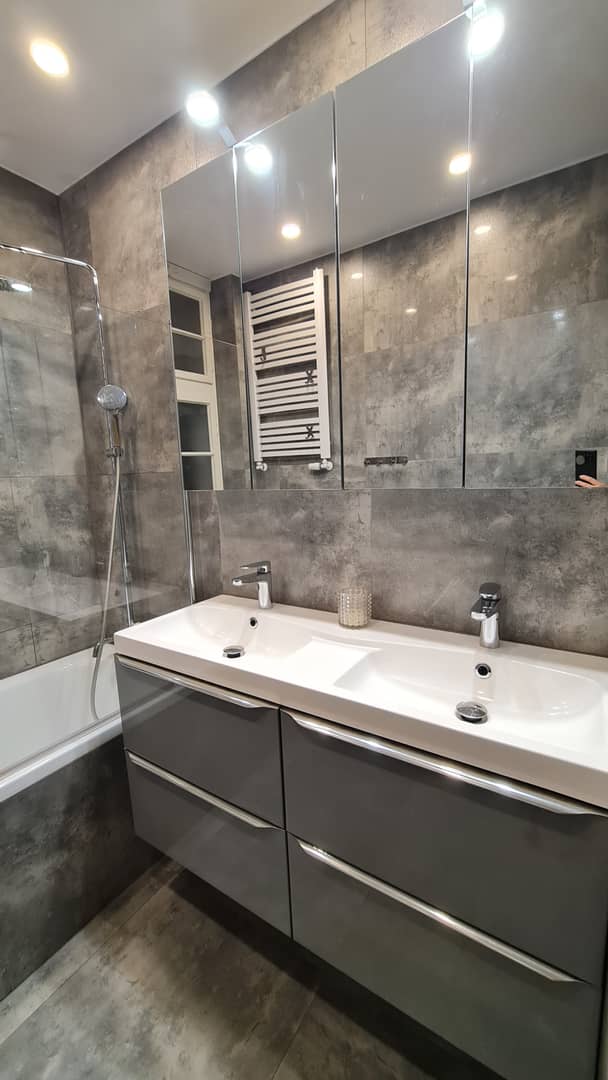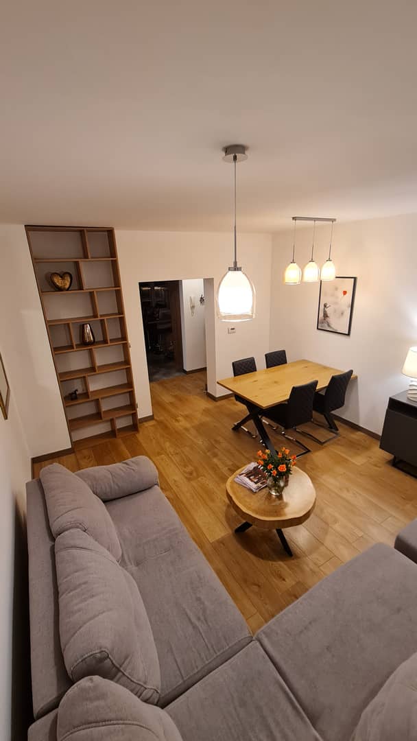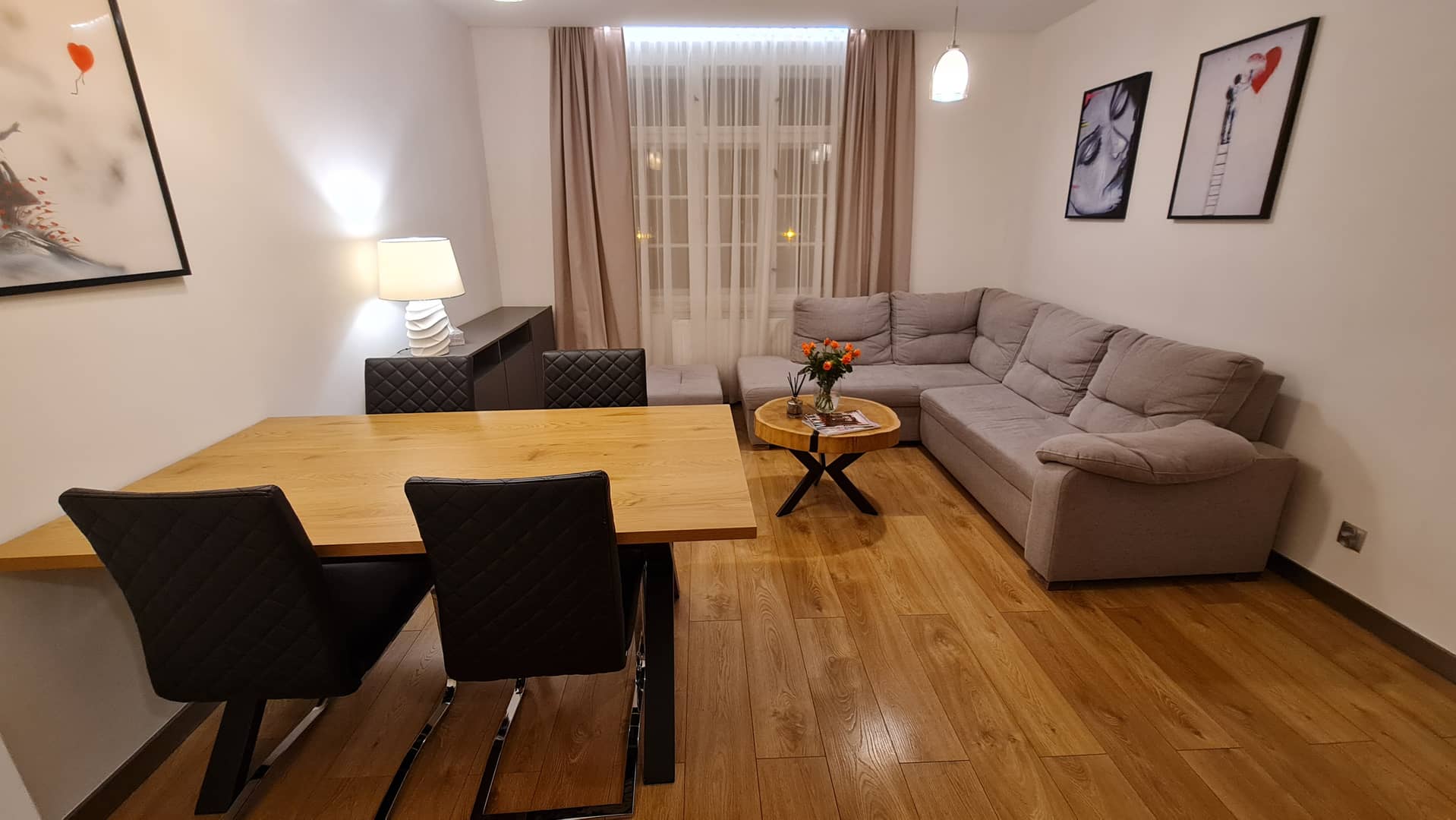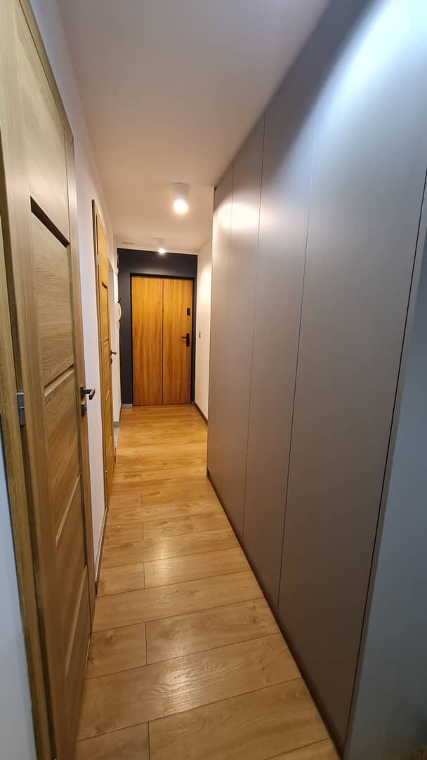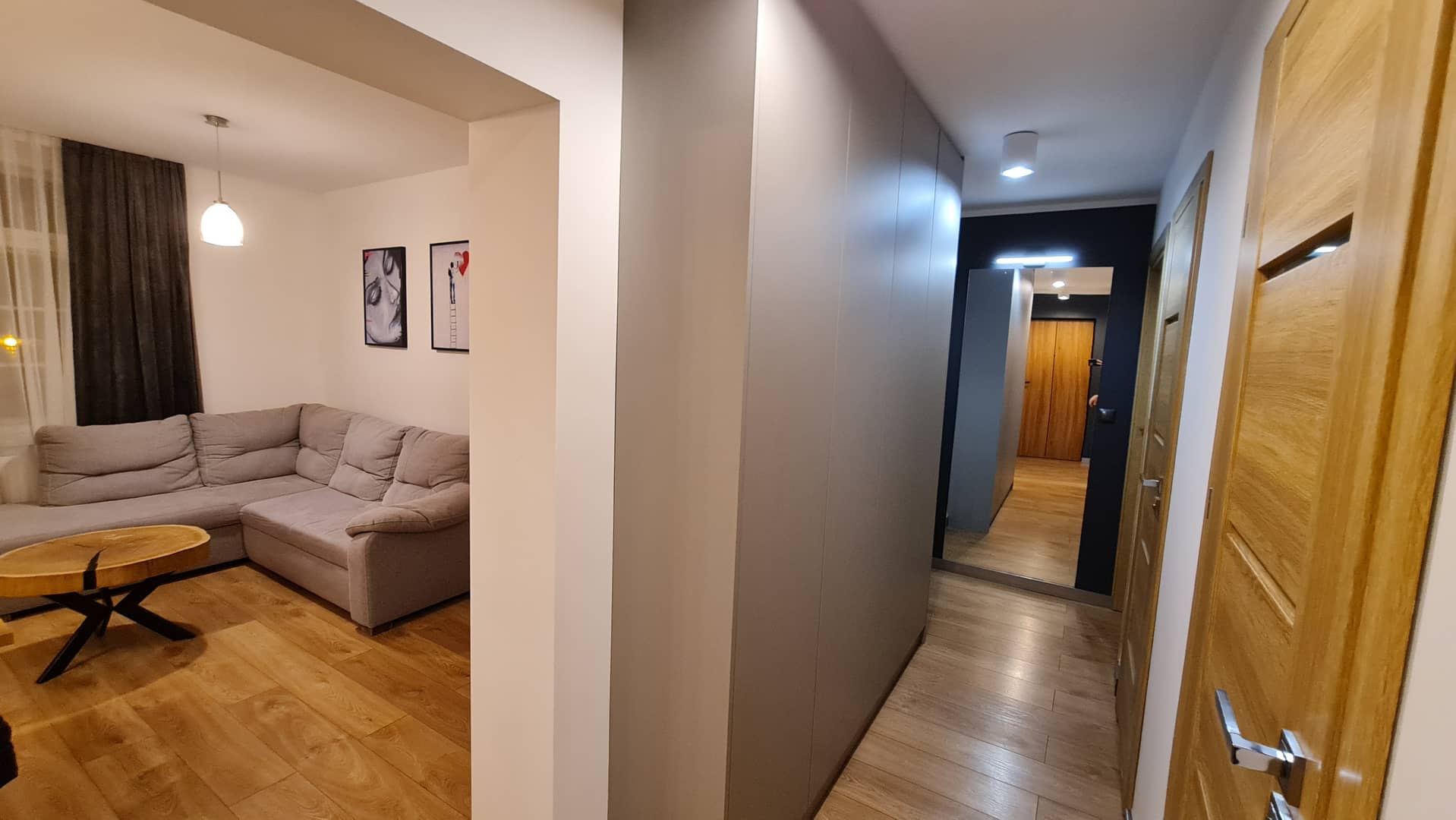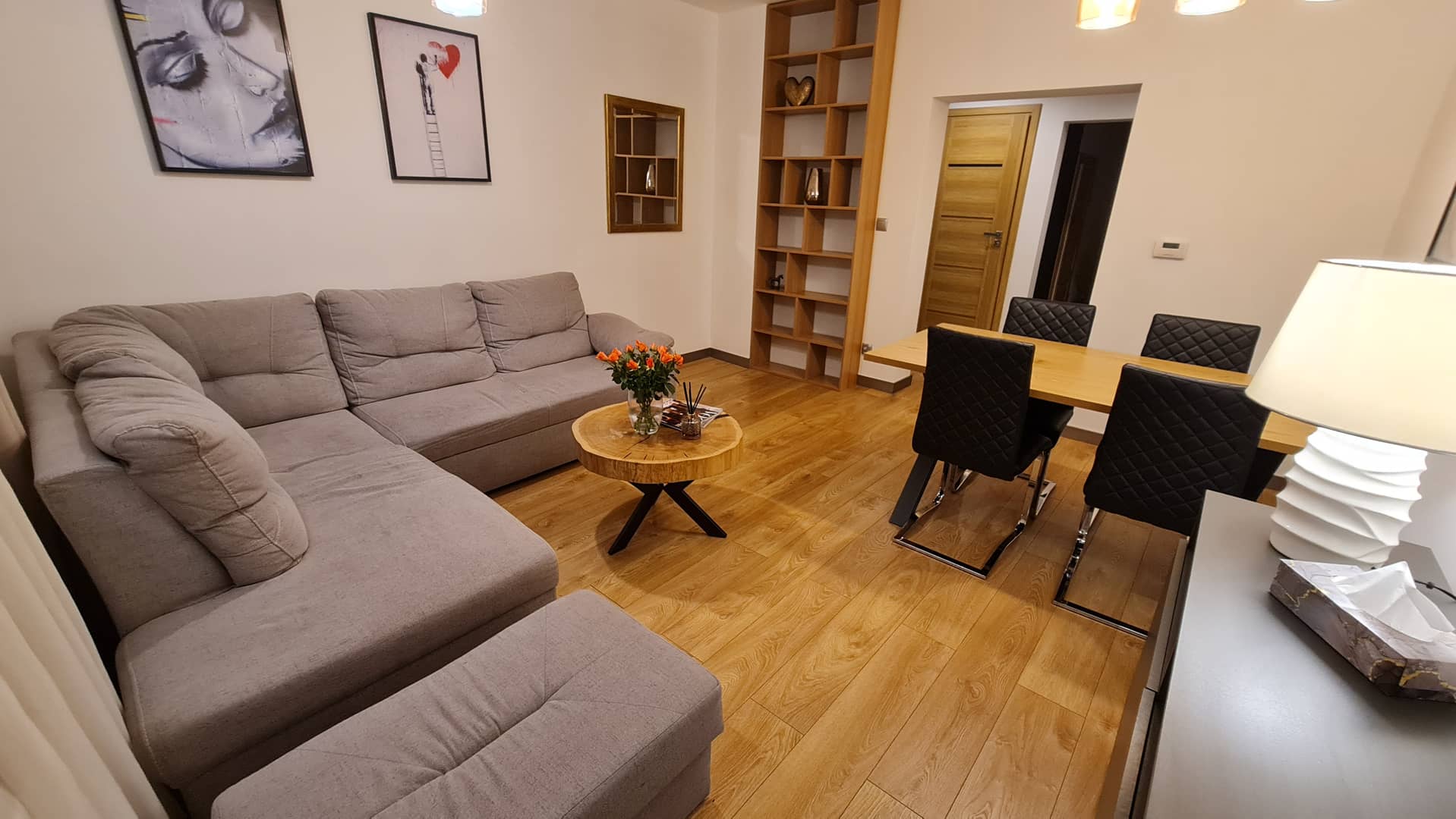 Mieszkanie: duży salon z aneksem kuchennym, duży przedpokój, łazienka, Na wyposażeniu szafa, komoda, narożnik z funkcją spania, fotel jednoosobowy do spania, komoda, meble kuchenne, zmywarka, k