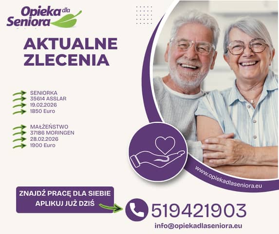 Zlecenie do Małżeństwa 37186 Moringen - Dolna Saksonia Od 28.02.2026 Na 6-8 tygodni 1900 EURO + opłacony przejazd Wymagania: komunikatywna znajomość języka niemieckiego tel.: 7869569