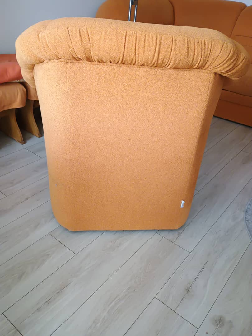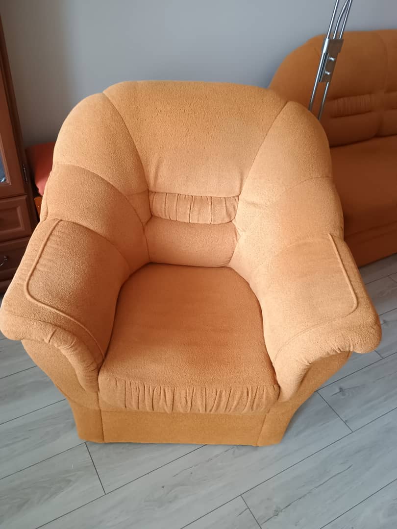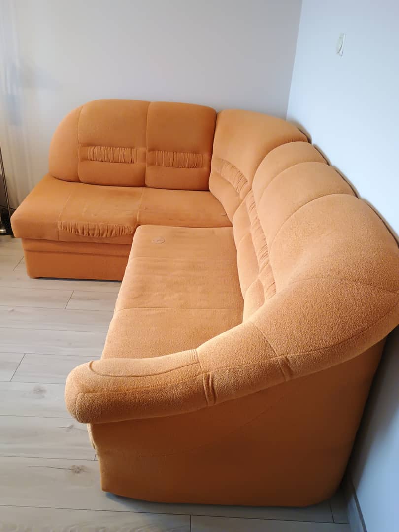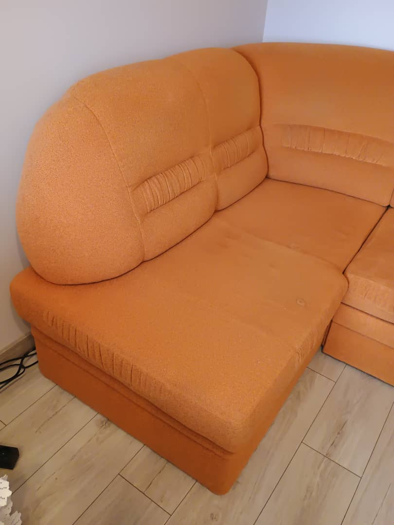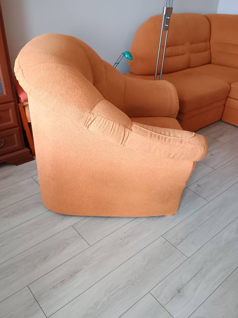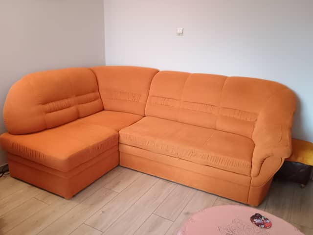 Sprzedam używany komplet wypoczynkowy , razem lub osobno . Do uzgodnienia . Wymiary narożnika : 235 x 165 cm / lewy / wys.93 cm. Ma funkcję spania o wymiarach 180 x 120 cm. Fotel bardzo wygodny wymiary szer, 100 cm / wys. 90 cm / siedzisko szer. 46 cm / gł.53 cm. Kolor pomarańczowy. Całość jest w dobrym stanie , bez wgnieceń , drobne ślady użytkowania. Cena z komplet 500 zł. Mysłakowice.