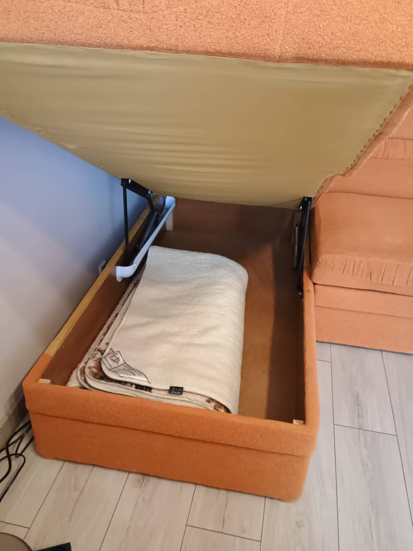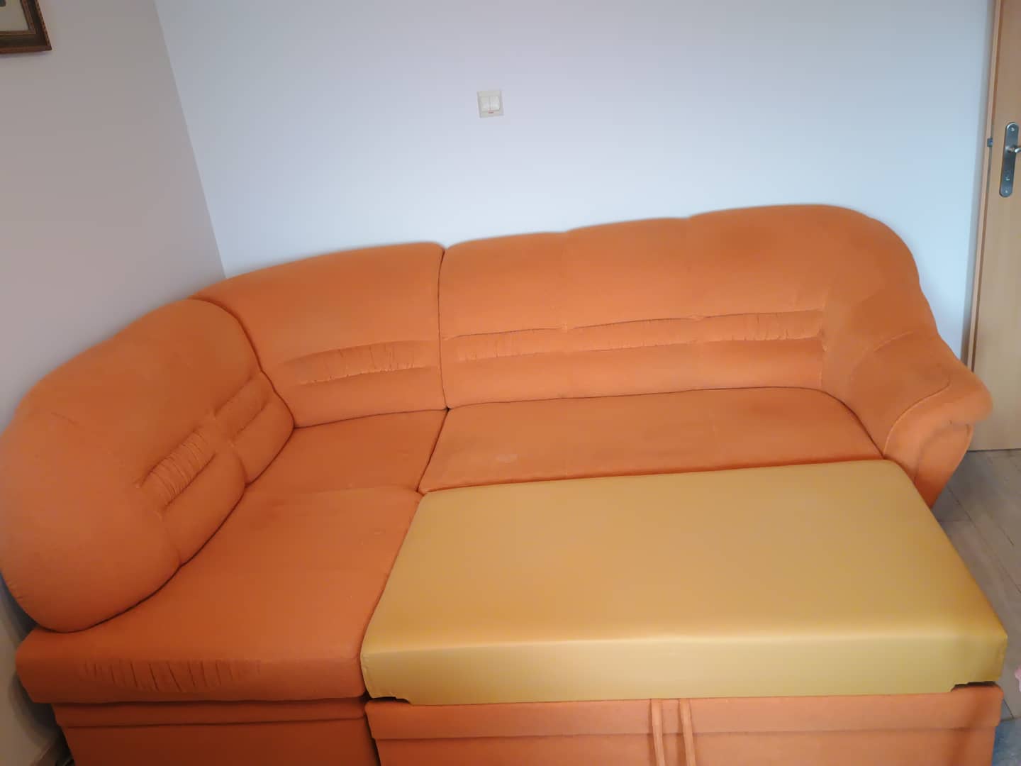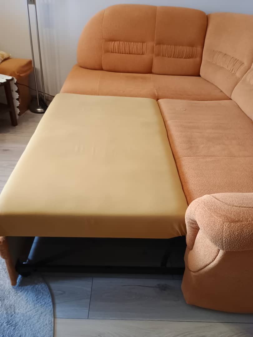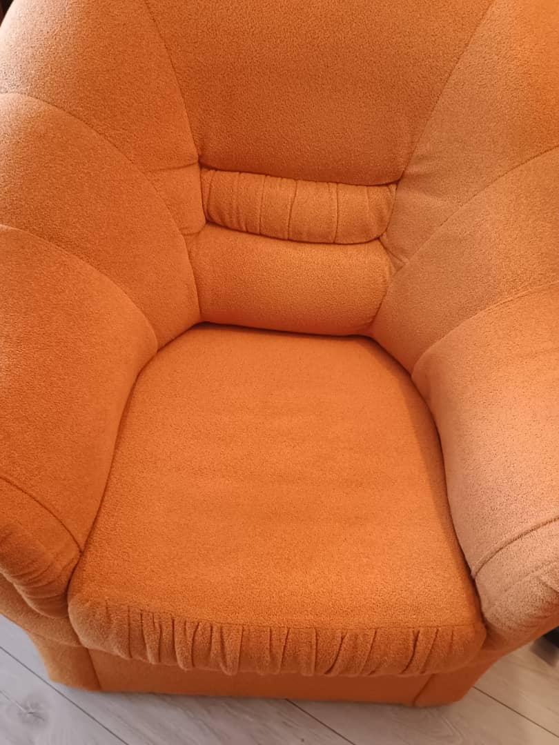 Sprzedam używany komplet wypoczynkowy , razem lub osobno . Do uzgodnienia . Wymiary narożnika : 235 x 165 cm / lewy / wys.93 cm. Ma funkcję spania o wymiarach 180 x 120 cm. Fotel bardzo wygodny wymiary szer, 100 cm / wys. 90 cm / siedzisko szer. 46 cm / gł.53 cm. Kolor pomarańczowy. Całość jest w dobrym stanie , bez wgnieceń , drobne ślady użytkowania. Cena z komplet 500 zł. Mysłakowice.
