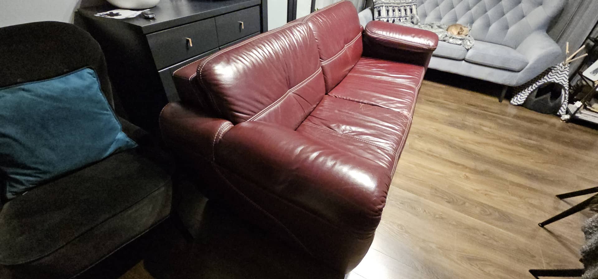 Skórzana sofa,z funkcja spania, która jest do oddania za symboliczna 100. Mebel jest używany. Może stanowić ciekawą opcję dla osób poszukujących kanapy, do siedzenia lub spania. Szr. 185 cm